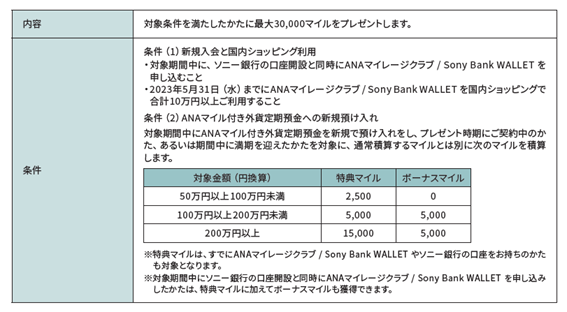 ソニー銀行株式会社(代表取締役社長:南 啓二/本社:東京都千代田区/以下 ソニー銀行)は、全日本空輸株式会社(代表取締役社長:井上 慎一/本社:東京都港区/以下 ANA)と「マイル獲得チャレンジ 最大30,000マイルプレゼントキャンペーン」を2023年2月1日(水)より実施しますので、お知らせいたします。