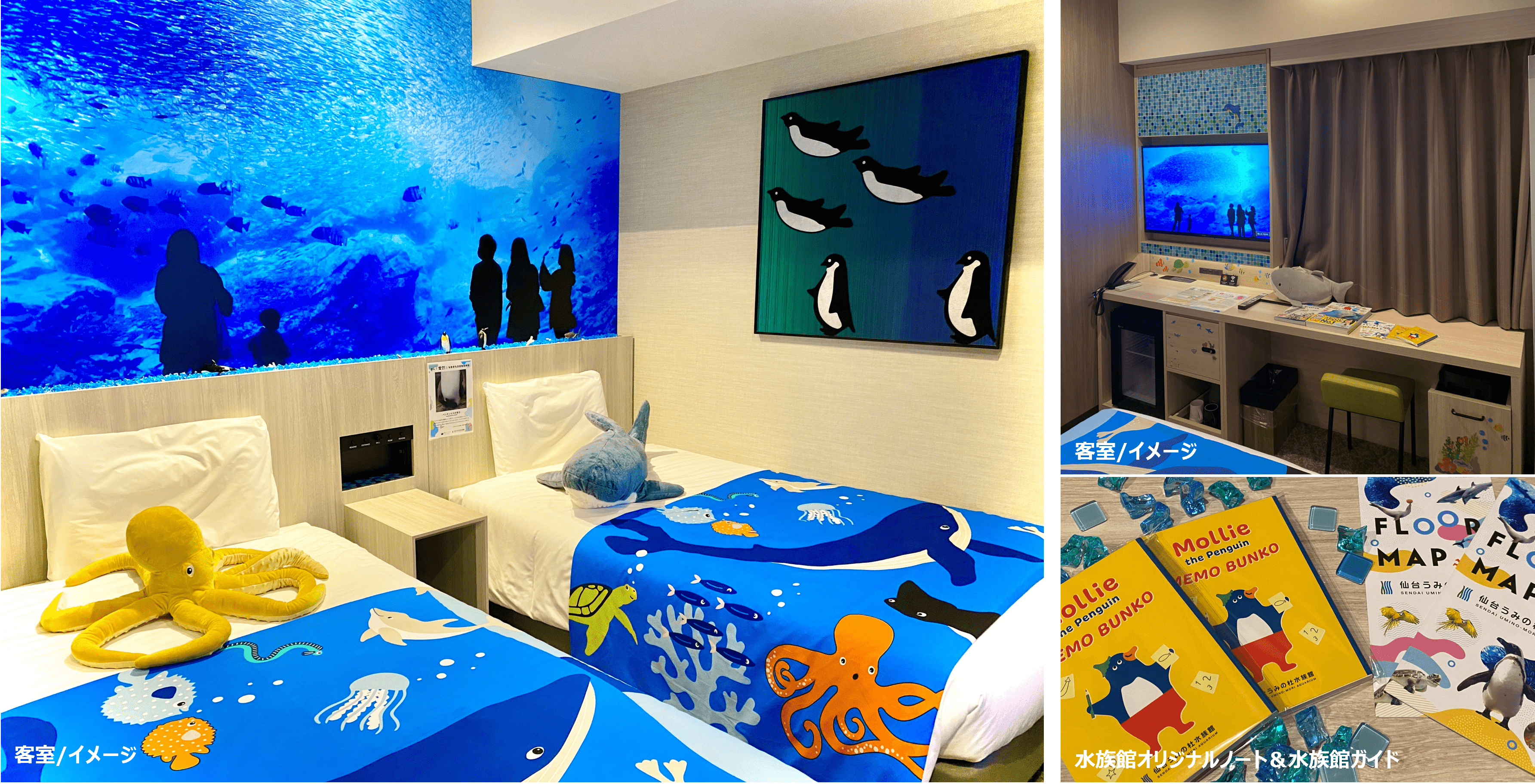 変なホテル仙台 国分町では、ホテルをただ寝泊りする場所ではなく、旅の思い出の一つにしていただけるよう、恐竜で装飾した恐竜ルームや自転車を客室まで持ち込めるサイクルルームなど、様々なコンセプトルームを販売しております。今回は、春休みのファミリー旅行シーズンに向け、また動物好きのお客様にお楽しみいただける新たな特別企画として、東北最大級の水族館「仙台うみの杜水族館」とコラボレーションした客室「変なマリンルーム」を2023年2月1日より発売いたします。