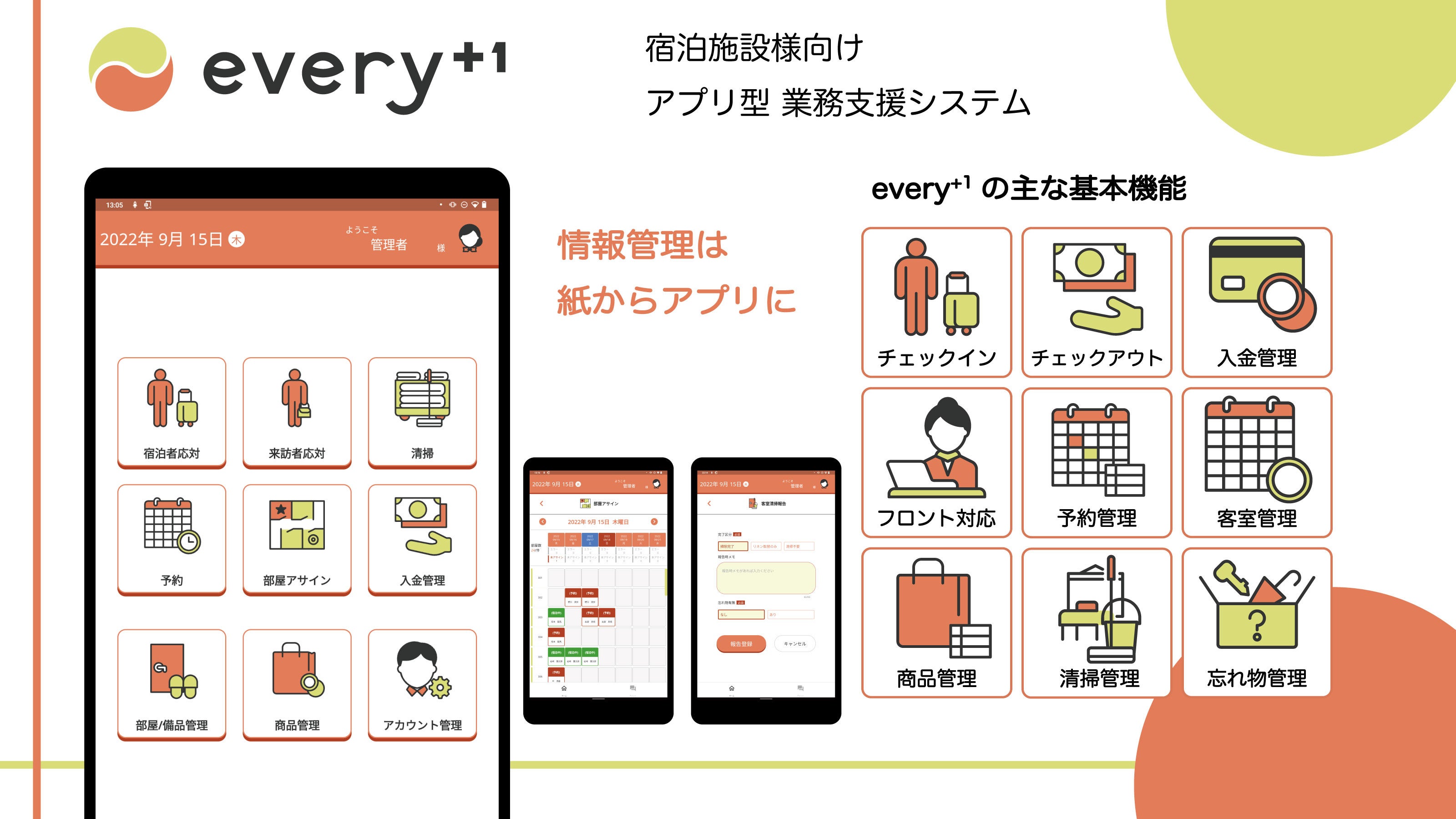 従来型の宿泊管理システム(PMS)とは異なり、モバイルアプリで宿泊の予約や会計情報を管理することができます。