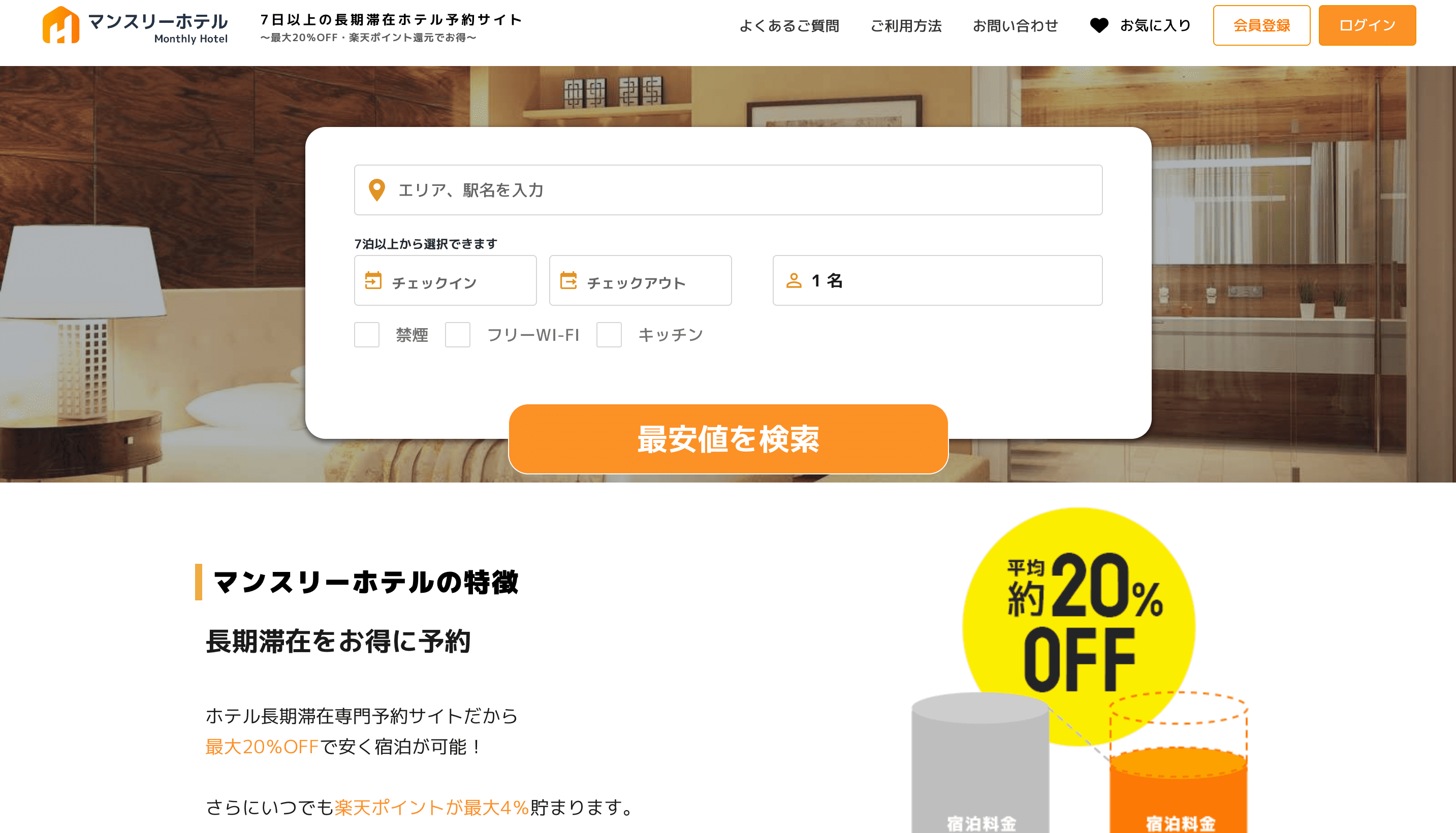長期滞在に特化した宿泊予約サイト(https://monthlyhotel.jp/forhotels/)