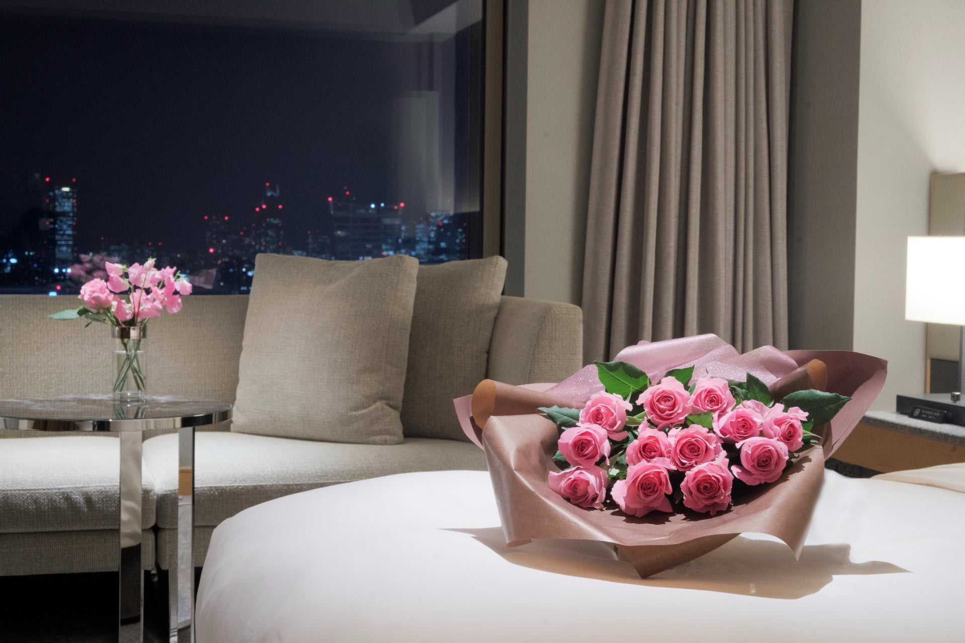 客室内をバラやスイートピーなどの香り華やかな花々で彩り、ロマンティックな意味を持つ特別なブーケ「1ダースのバラ」をご用意いたします。室内の生花や花束はご宿泊後にお持ち帰りいただけます。