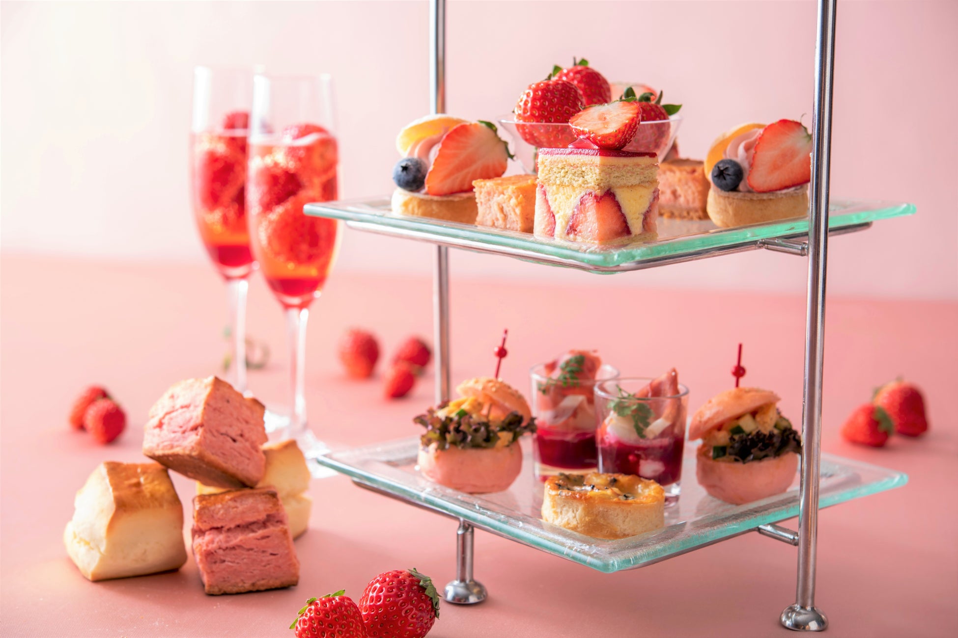 フレッシュな苺と濃厚なクリーム、ピスタチオのビスキュイが層を成す目にも美しいフレジェや、パフェスタイルにアレンジした苺のショートケーキなどの人気アイテムのほか、クレープ生地で苺を丸ごと包んだロールケーキや、ストロベリークリームとカスタードクリーム、甘酸っぱい苺のハーモニーが楽しめるプチシュークリームなどの新作スイーツも揃います。セイボリーには、ピンク色のバンズでサンドしたミニバーガーや、真っ赤なビーツのソースが彩りを添える生ハムとモッツァレッラチーズのグラスサラダなど趣向を凝らした3種をラインナップ。