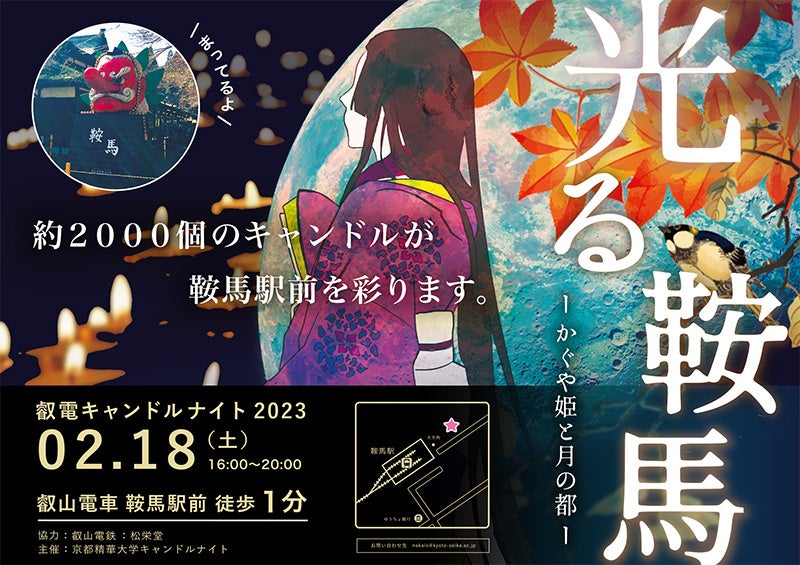 京都精華大学では、叡山電鉄株式会社(京都市左京区、社長:豊田秀明)、株式会社松栄堂(京都市中京区、代表取締役社長:畑正高)の二社のご協力のもと、叡山電車「鞍馬」駅前広場を2000個のキャンドルで彩る、産学連携プロジェクトを実施いたします。