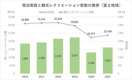 な自然とその恩恵を受けた生活が今もなお受け継がれています。日本を訪れる観光客にとっても富士山は人気のスポットですが、ほとんどが日帰り観光で、富士エリアの持つ魅力を十分に体感していただけないことが課題でした。訪日外国人数が過去最高となった2019年においても、29,601人の観光レクリエーション客数に対して宿泊客数は2,237人と、富士地域に宿泊する訪問者は8%にも満たないのが現状です(※)。水際対策がいよいよ緩和され、今後インバウンド観光客の増加が見込まれる中、高まる多様な観光ニーズへの対応が求められています。