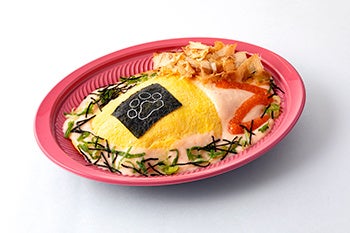 おかかご飯を使用した明太クリームソースのオムライス。おかかやネギをちらし、にゃらんの肉球型の海苔を添えて和風テイストに。