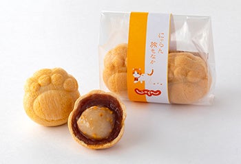 コロンとしたフォルムが愛らしい、にゃらんの肉球型最中。金ごま入りのふくよかな求肥餅をこし餡で包んだ、見た目もかわいい一品。
