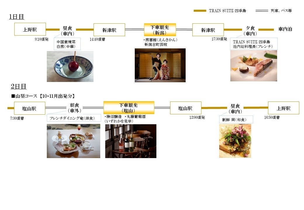 「1泊2日コース(山梨)/秋」は、「みなとまちが育んだ豪商の粋と、豊かな里山の恵みを味わう旅。」をテーマに、上野駅を出発し、新潟県と山梨県を巡ります。