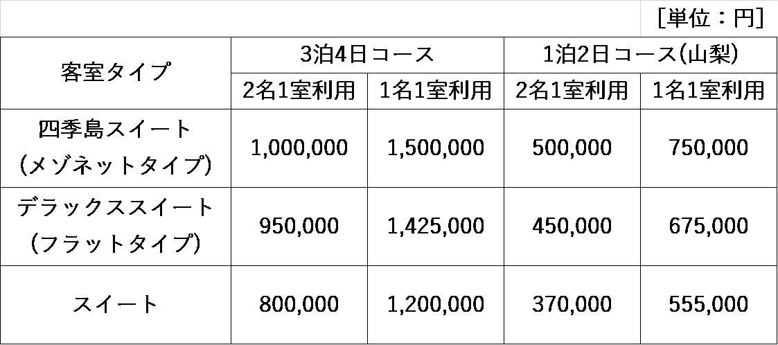 多くのお客さまからご好評をいただいている、「3泊4日コース/秋」、「1泊2日コース(山梨)/秋」のコースを継続して設定します。
