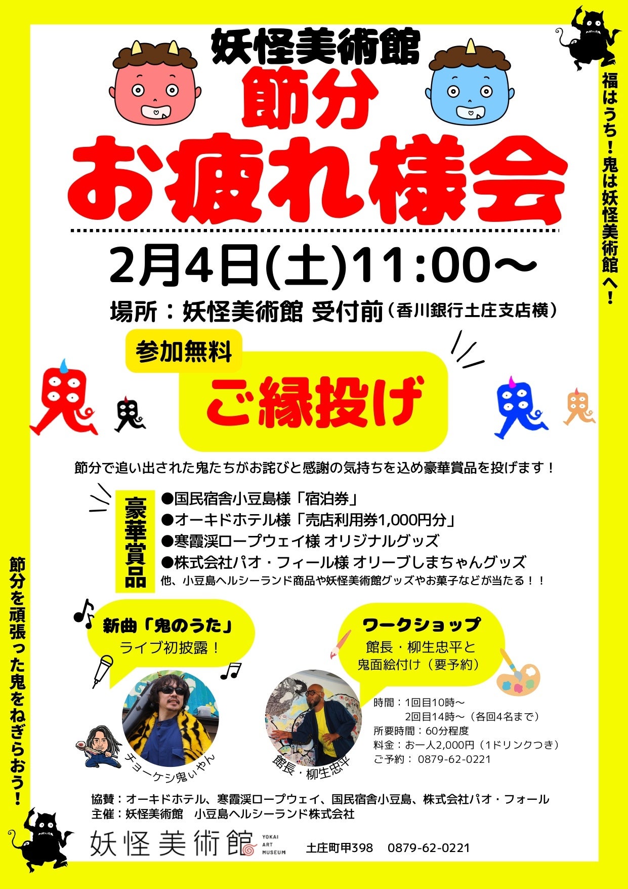 この賞品は、「ご縁投げ」として当日美術館の二階から集まった参加者に向けて投げます。節分にあわせて「鬼の避難所」を開設した妖怪美術館や、温かく鬼を迎えてくれた小豆島の人たちに鬼たちが感謝の気持ちをこめ振る舞います。また、小豆島でいま注目を集めている「チョーケシ兄やん」(妖怪美術館のマネージャー)制作の新曲による歌とダンスを初披露。妖怪画家(妖怪美術館館長)の柳生忠平は鬼面絵つけのワークショップを開催します。