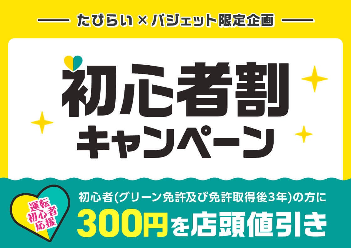 株式会社パム(本社:沖縄県那覇市、社長:長嶺 由成)は、旅行情報サイト「たびらい」のたびらいレンタカー(https://www.tabirai.net/car/)にて、運転初心者≪グリーン免許及び免許取得後3年≫の方の応援企画として「初心者割キャンペーン」を実施中です。たびらい限定価格からさらに300円の割引となります。