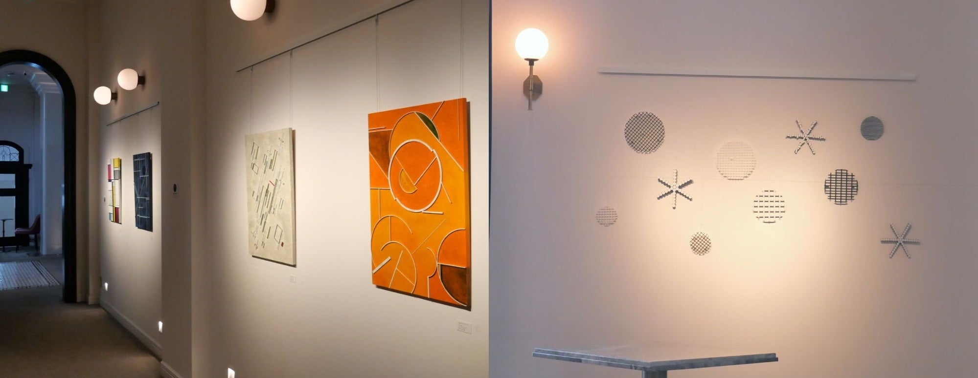 今回は、UNWIND HOTEL&BAR 小樽のクラシックコンテンポラリーな空間を意識し、「アール・デコ様式に沿った構築的・建築的な作品」をテーマとした平面作品と立体作品を計7点展示します。アール・デコ様式からの流れでロシア構成主義やドイツバウハウスのデザイン美に影響を受けている氏は今回、赤・白・黒を中心としたシンプルな色使いとストライプやドット、丸、四角等で構成された作品を選定。壁と一体になったような半立体作品や、緻密に構築された「星をイメージした作品」は、ホテルのクラシカルな空間の中にエッジの効いた空気を生み出します。4点の平面作品は、ホテルが建設された1930年頃のアートシーンに沿ったデザインで空間に彩りを添え、ホテルの特徴でもあるアール型の入り口や球体の照明と見事に調和し、どこか懐かしくレトロな雰囲気を生み出しています。1900年前半を歩んだアール・デコ様式と構成主義、それぞれの美学に独自の視点を加えた唯一無二の空間をお楽しみください。