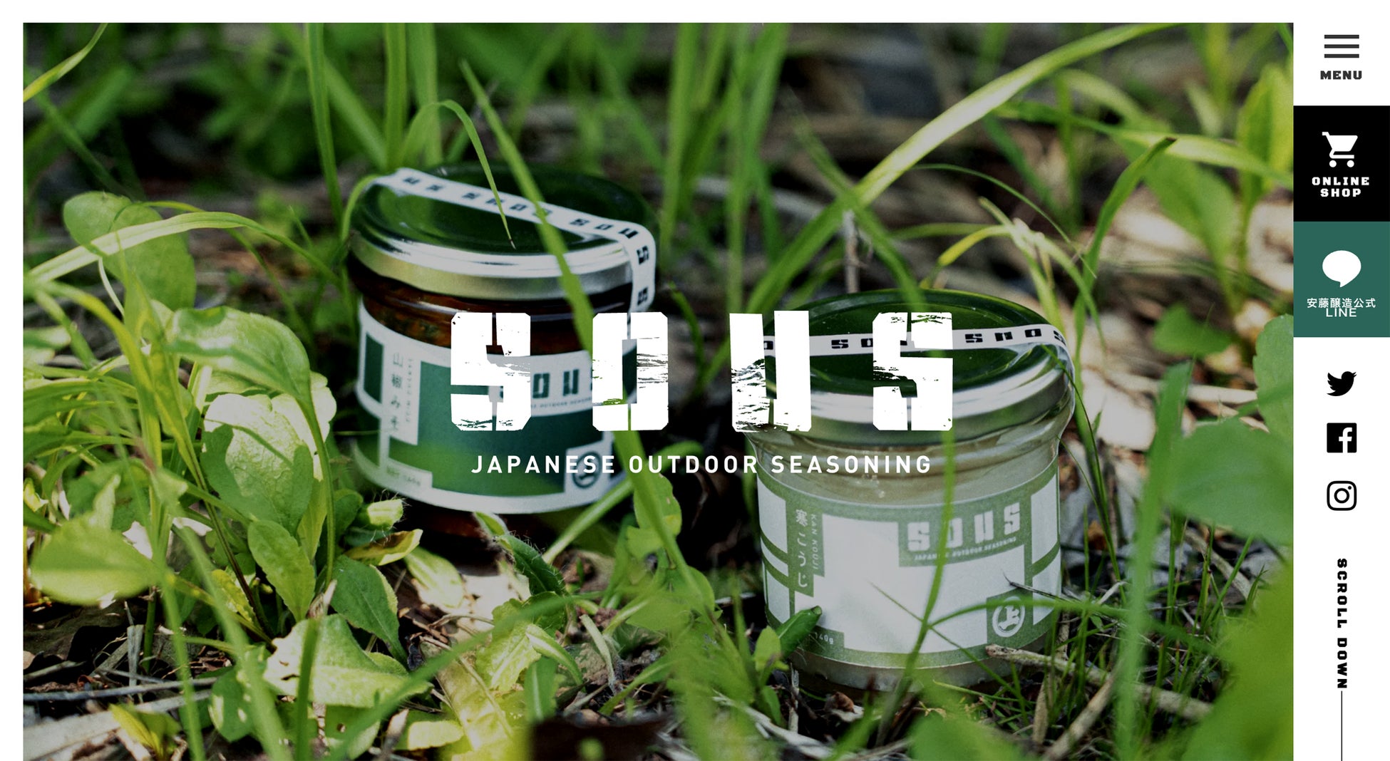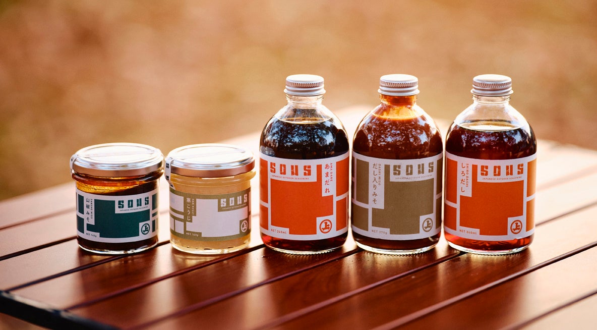 和の調味料をアウトドアでも使えるようにリブランディングした商品、「SOUS」。スパイス一辺倒になりがちなアウトドア調味料界隈に、一味違ったワイルドな体験をもたらすことに主眼を置いています。塗って、かけて、焼いて、それだけでできあがるワイルドな野性的料理が体験できるのが特徴です。