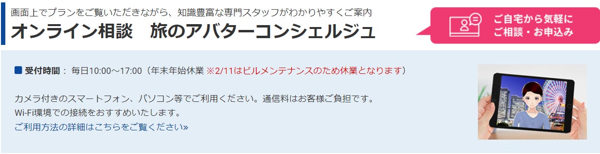 | 【近畿日本ツーリストのオンライン相談:旅のアバターコンシェルジュ™】 近畿日本ツーリストでは画面上でプランをご覧いただきながら、知識豊富な専門スタッフが、「アバター」を介してわかりやすくご旅行のご相談やお申込を承るサービス、旅のアバターコンシェルジュを展開しています。ぜひこちらもご活用ください。 https://www.knt.co.jp/ec/avatar/#ancl02 |
