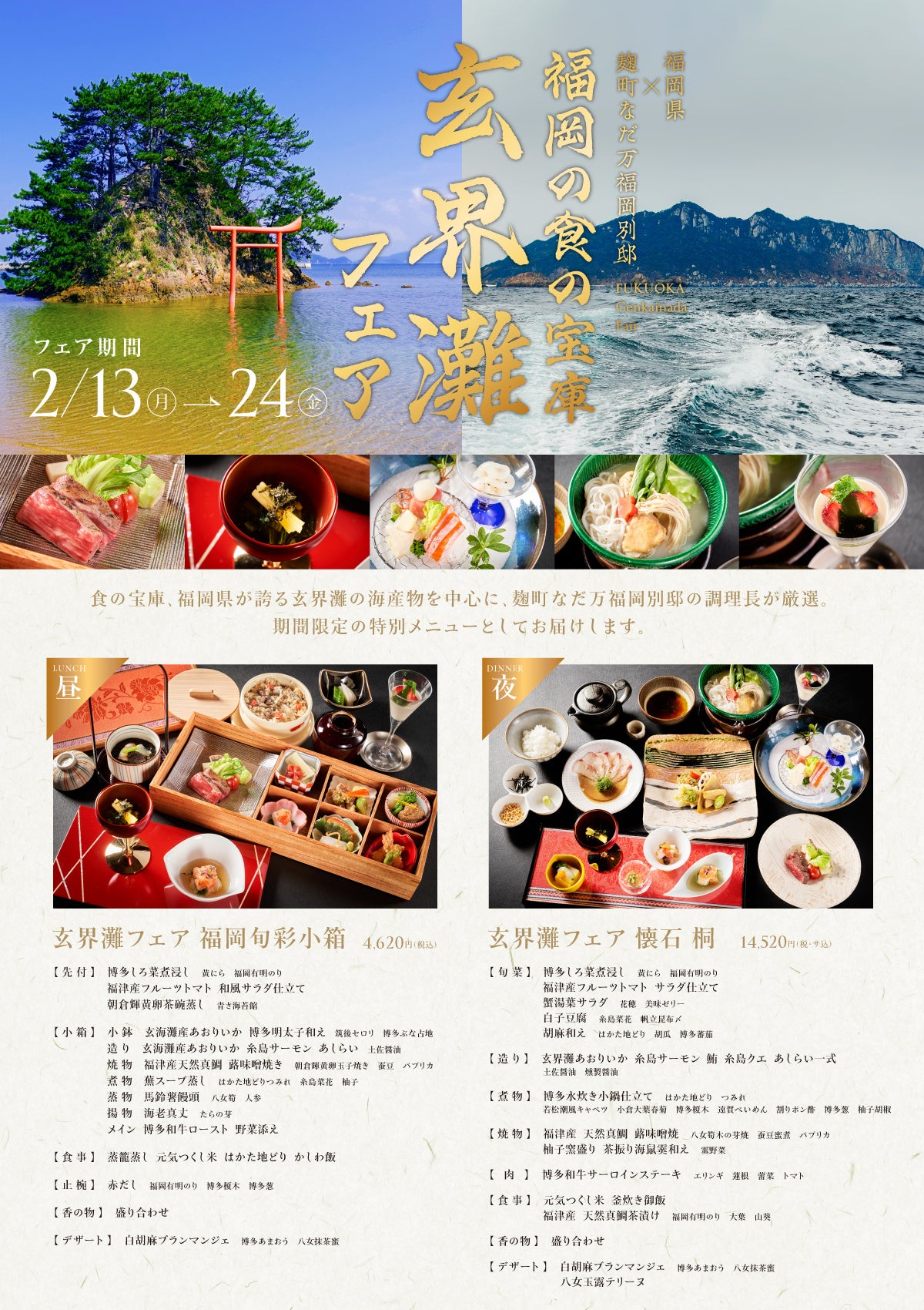 福岡県では、『福岡の食の宝庫 玄界灘フェア』と題して、福岡県アンテナレストラン「麹町なだ万 福岡別邸」(東京・半蔵門)にて、玄界灘の豊かな陸の恵みを味わえる特別メニューの提供を行います(2023年2月13日(月)~24日(金)まで土日祝除く)。