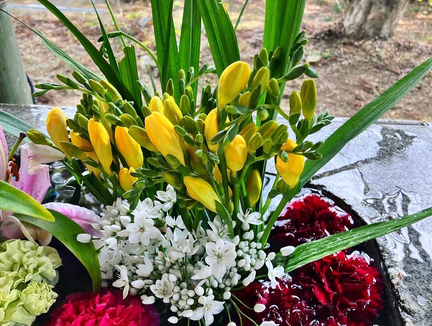 那賀町産の色とりどりの花きで花手水を行い、参拝客を癒やします。