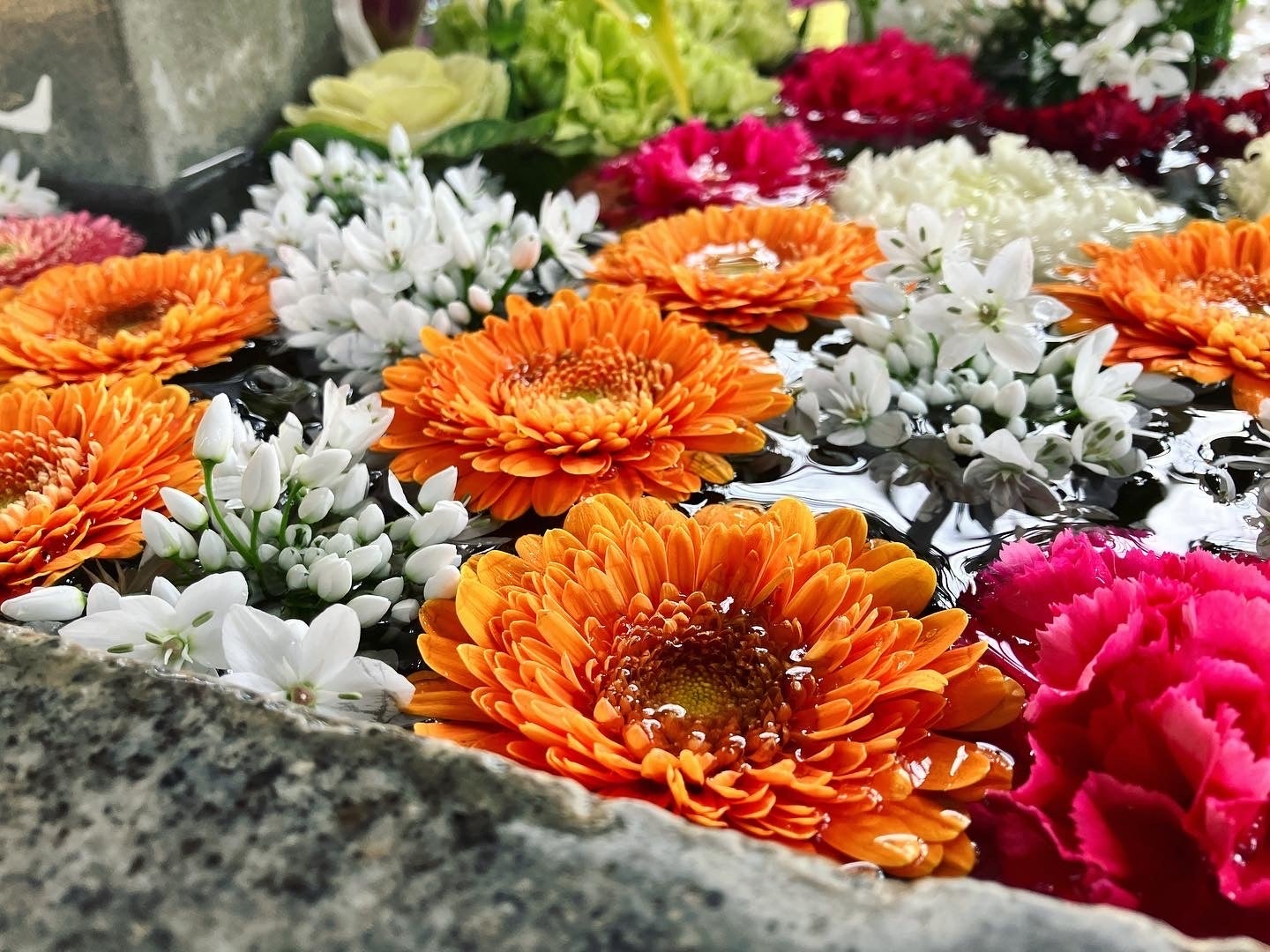 ※花手水とは:神社仏閣の手水舎(てみずや)で花を浮かべる取組み。コロナ禍で、使用されなくなった手水舎の活用と、「参拝客を少しでも癒やせるように」という思いから、全国的に広がっています。