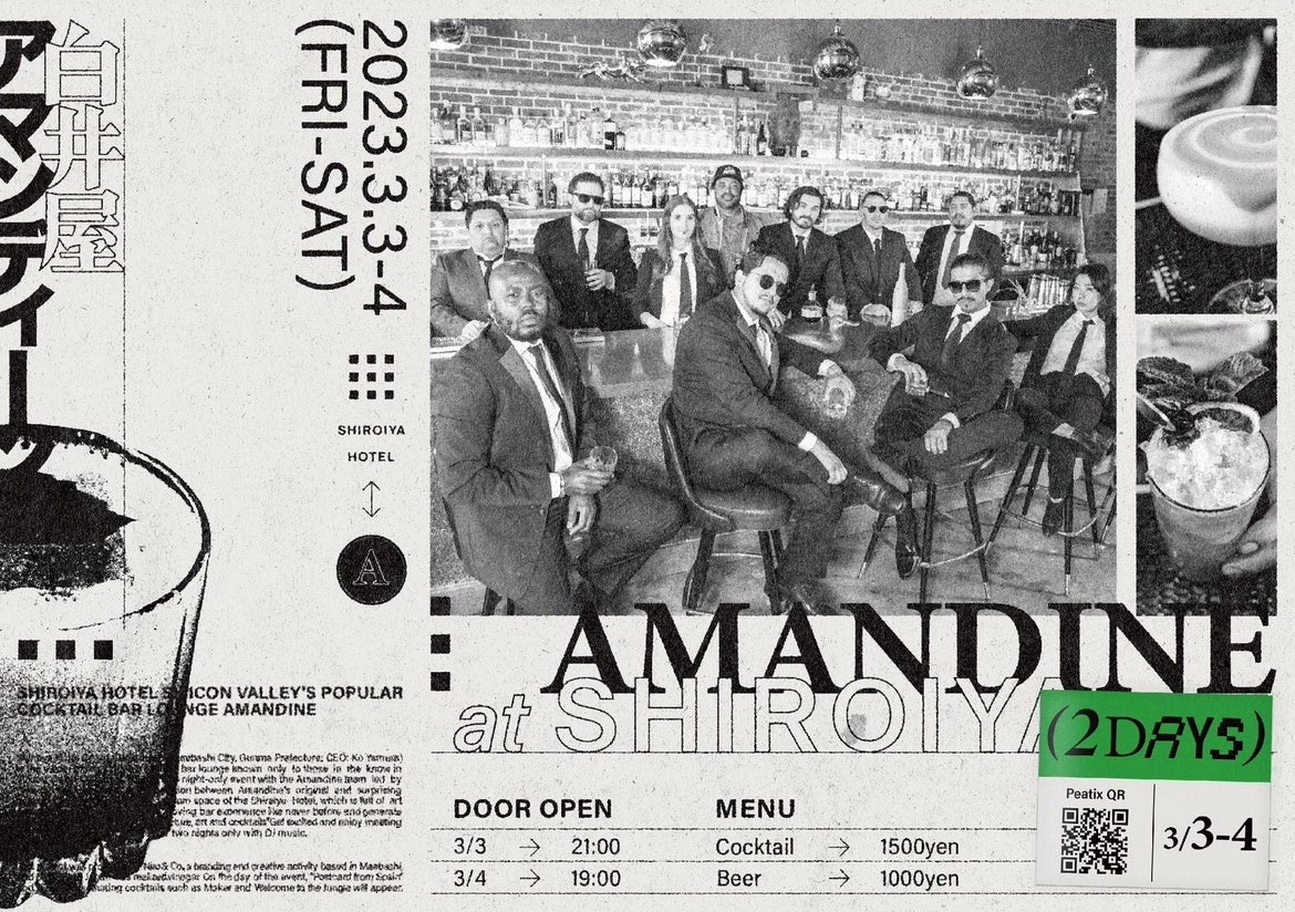 本企画は前橋を拠点にブランディングやクリエイティブな活動を手がけるNiro & Co.がプロデュースを手がけ、米国から本家本元のバーテンダーが来日し、2夜限りのイベントが実現します。Amandineのクールで熱いバーテンダー、ジェームズさんの手による「Postcard from Los Altos」「Peace-Maker」「Welcome to the Jungle」などの魅惑のカクテルが白井屋ホテルに登場します。