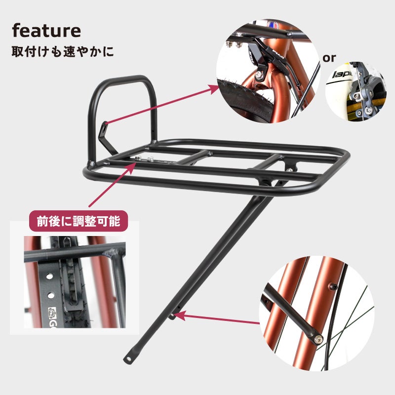 スポーツ自転車でのツーリングやお買物が多い街乗りにぴったりのフロントラックです