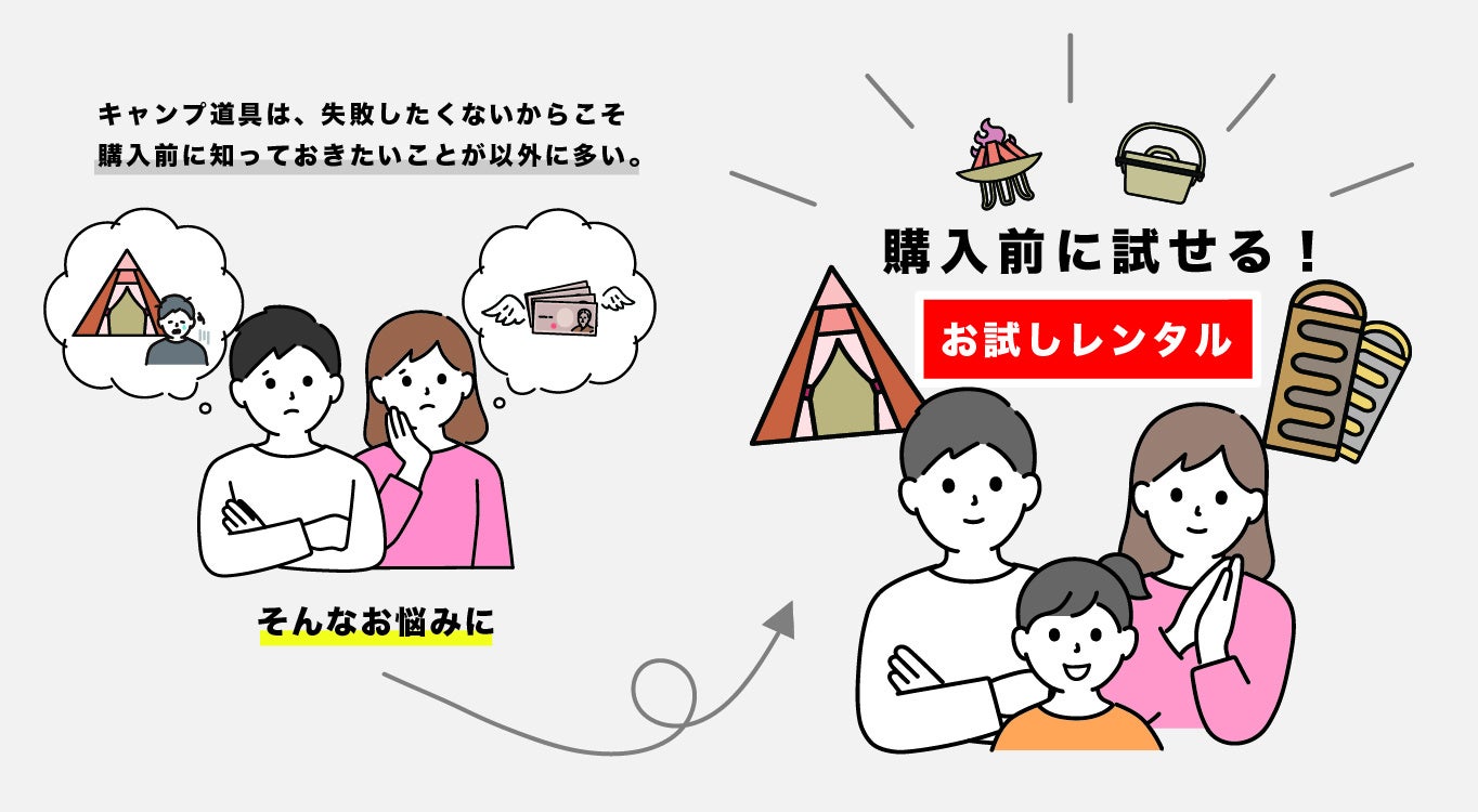 より多くの方にブランドのキャンプ用品を試してもらえるように「お試しレンタル」として通常のレンタルに比べお得な料金でレンタルすることができます。