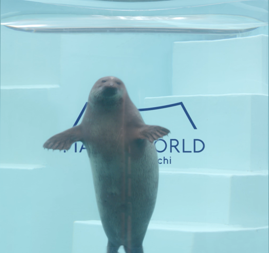この度、新登場となった「TENJIN TREE VISION」ですが、LEDビジョンの形状が当館 1階の「うみなかCUBE(よみ:うみなか・キューブ)」内の水槽と同じ円柱形であるため、LEDビジョンを水槽に見立て、アザラシが登場する映像を制作し放映する運びとなりました。