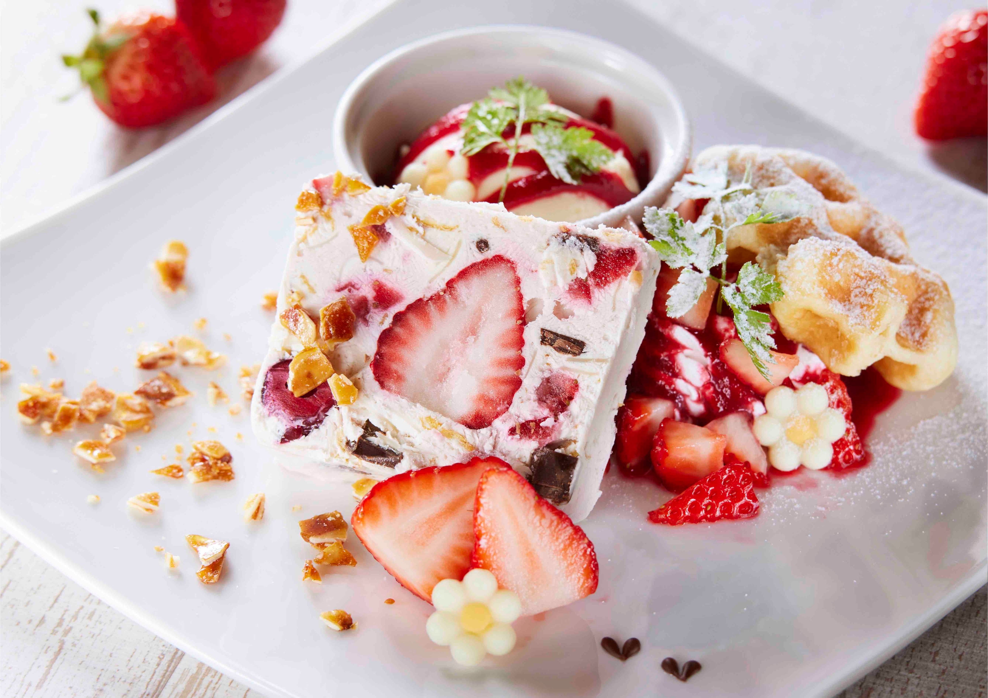 苺を贅沢に使用した、デザートプレート。新感覚スイーツ”カッサータ”・ワッフル・アイスを一度に味わえる一品。