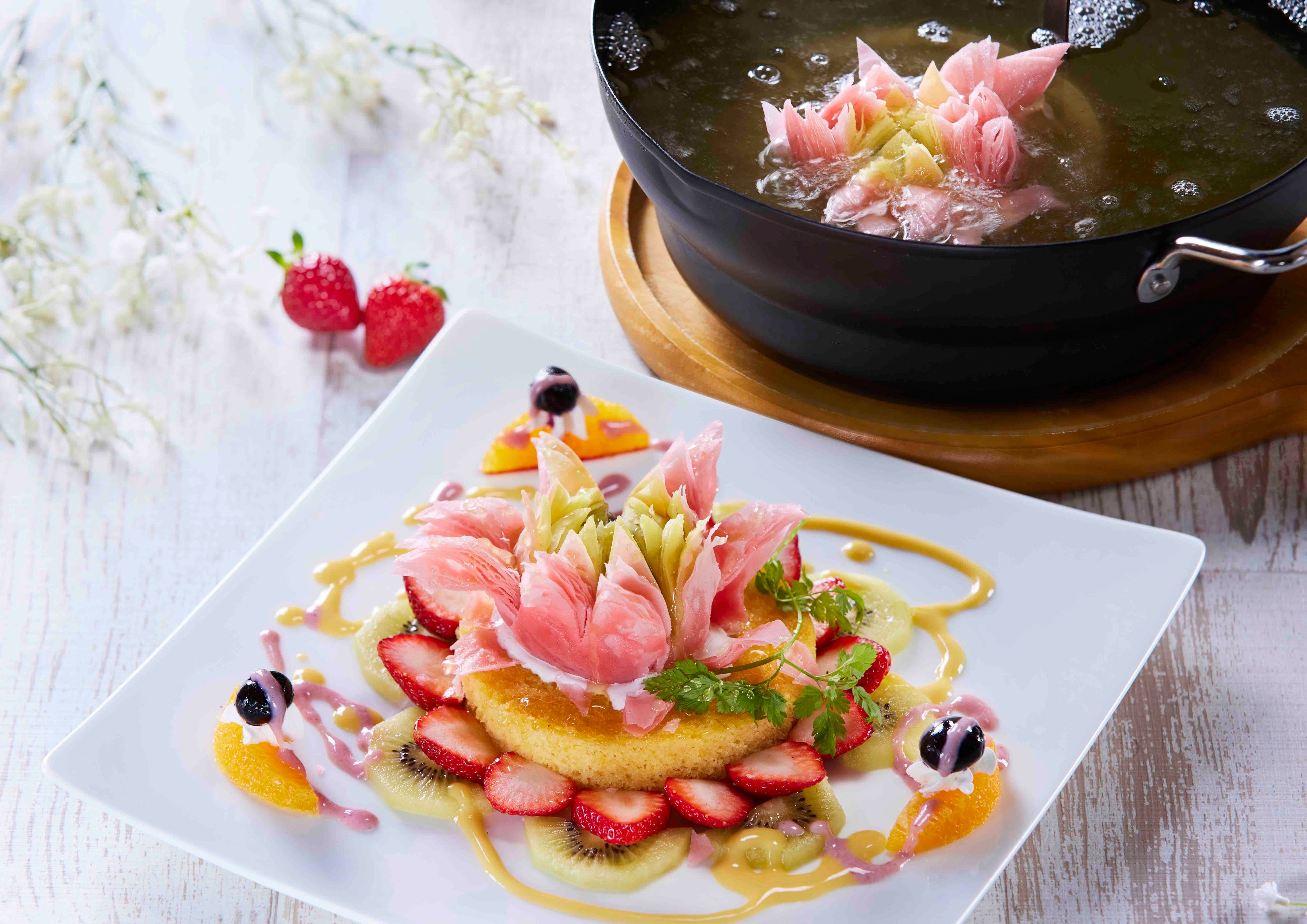 中華の伝統的な点心のパイを春バージョンにアレンジしたマーラカオ(中国カステラ)を盛り込んだスイーツ。