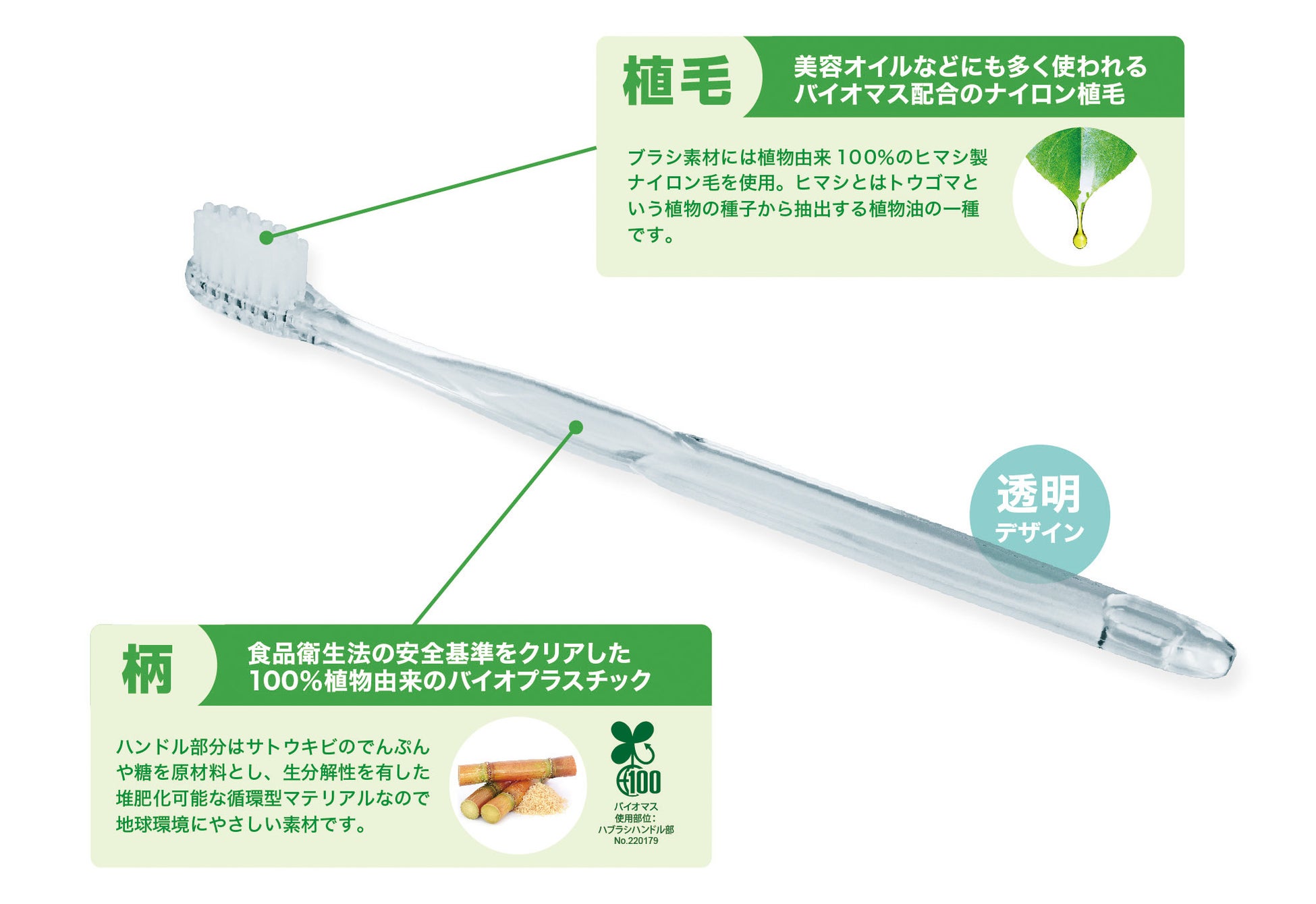 この「ボタニカル歯ブラシ」は、ハンドル(柄)部分にはサトウキビの澱粉や糖から生成された100%植物由来の樹脂を使用し、植毛には美容オイルにも使用される植物のトウゴマ種ヒマシ油から生成された100%植物由来のナイロン毛を使用しています。生分解性を有しており、堆肥化可能で自然に還る循環型商品になります。