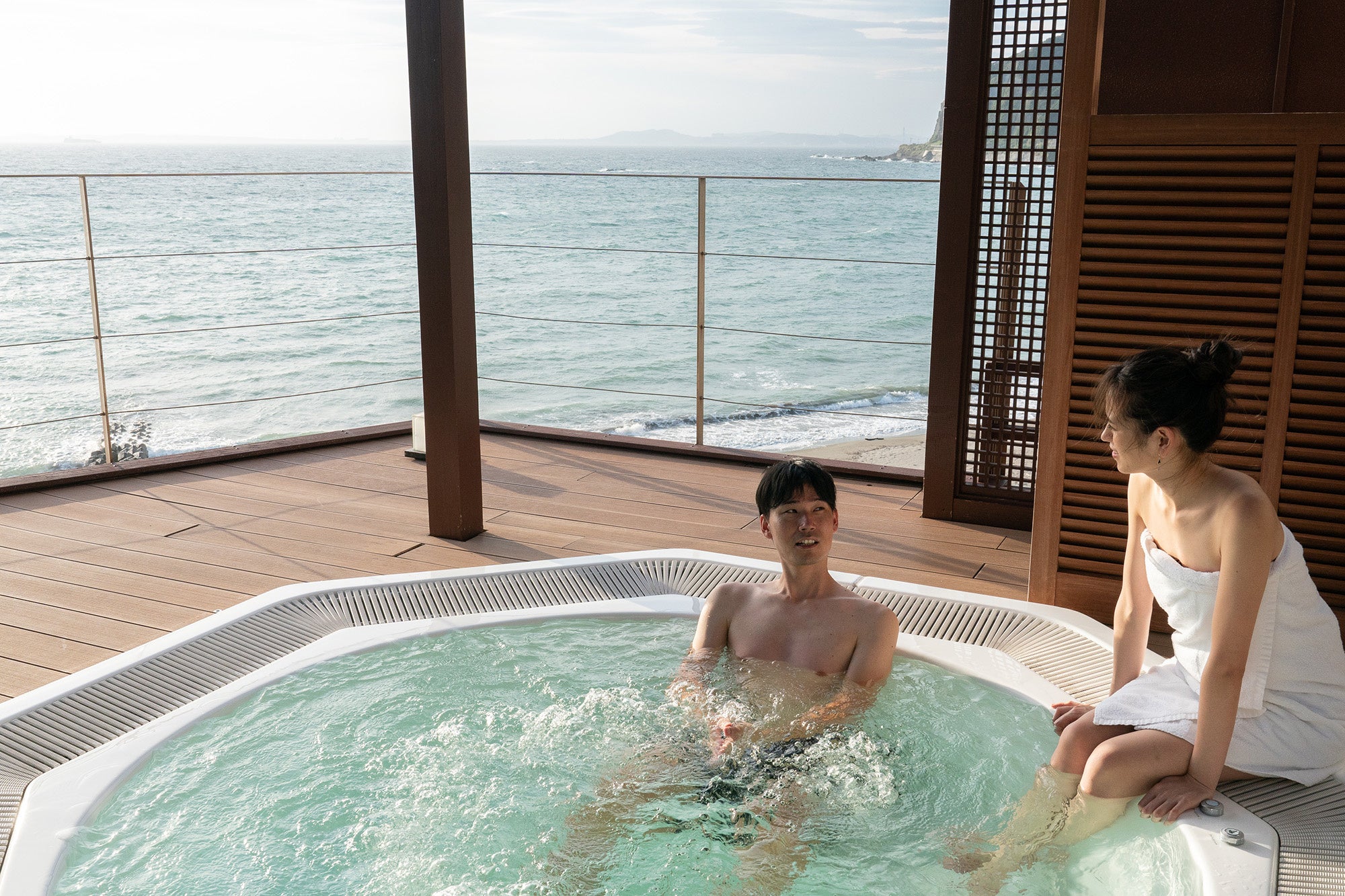 amaneをご利用のお客様は「ゆうみ」1Fの貸切風呂が無料でご利用OK!最上階には自慢の展望貸切露天⾵呂もございます。刻々と移り変わる夕暮れ時は、まさにため息の出る美しさ。さざめく潮騒の子守歌の中、海の包容力に包まれた贅沢なひとときを、ぜひ堪能ください。館内ではカップルでのエステ施術もお愉しみいただけます。