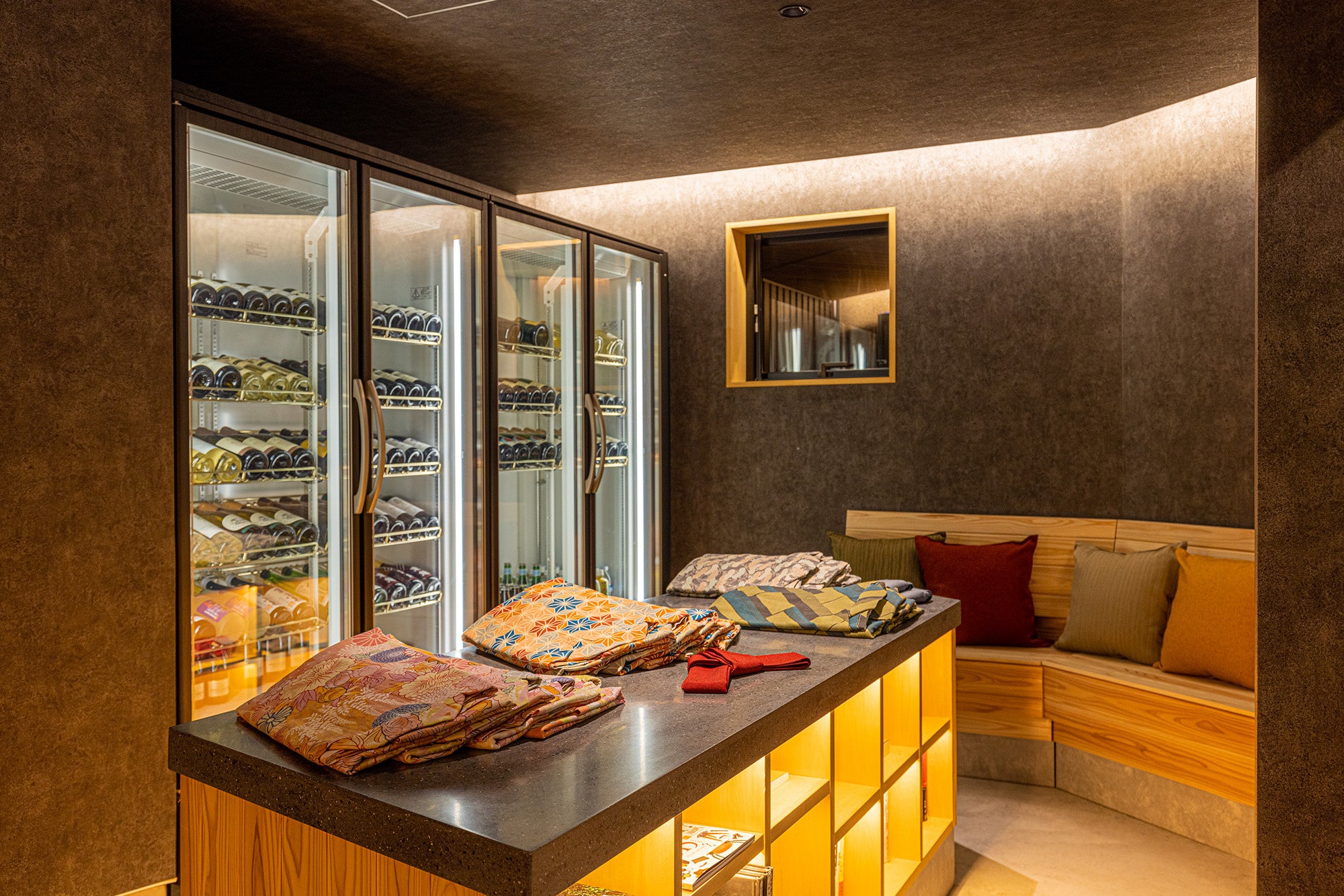 各お部屋にも部屋着をご用意しておりますが、浴衣で過ごしたい方のために、エントランスロビーにはお好みで選べるおしゃれ浴衣(男女)をご用意。また、セラーにはシャンパンや日本酒、当地の地ビールなども取り揃えております。ご利用の際はスタッフまでご用命くださいませ。