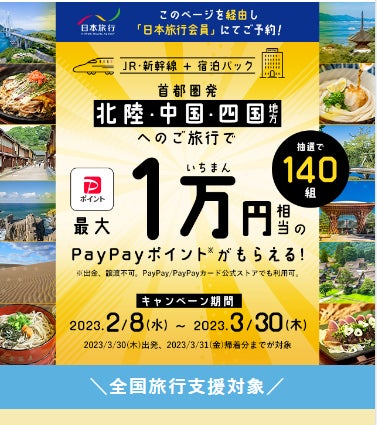 株式会社日本旅行(本社:東京都中央区、代表取締役社⻑:⼩⾕野悦光)は、WEB商品限定で首都圏出発の北陸・中国・四国地方行きJR・新幹線+宿泊パック商品をご購入のお客様へ、抽選でPayPayポイントが当たる旅行応援キャンペーンを2月8日(水)より開催します。
