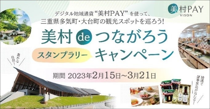 キャンペーン期間中、1月にサービスを開始したデジタル地域通貨「美村PAY」に会員登録&三重県多気町・大台町の観光スポットを巡ると、地域の施設利用券や地産品の詰め合わせなど、素敵な景品が抽選で当たります。多気町・大台町の複数のスポットを訪問すると抽選確率があがるダブルチャンスもあります。