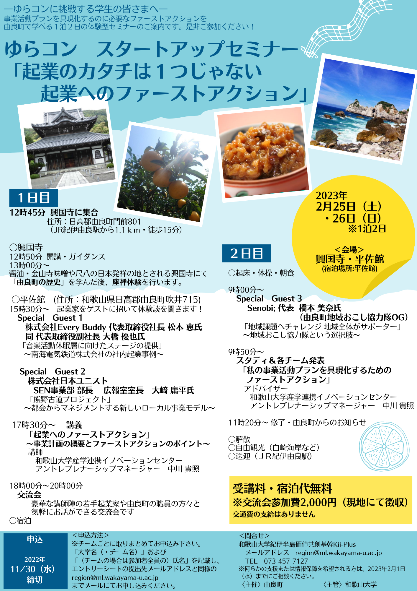 コンテスト終了後のプログラムとして、日本ユニストの大﨑のほか、株式会社Every Buddy 松本恵様・大橋優也様、Senobi;橋本 美奈様(由良町地域おこし 協力隊OG)ら多様な起業家をゲストスピーカーに招き、プランを具現化するアクションについて学ぶ「ゆらコン スタートアップセミナー『起業のカタチは1つじゃない 起業へのファーストアクション』」を由良町で開催します。本審査会出場者のうち希望する学生(3チーム8名の予定)が参加します。