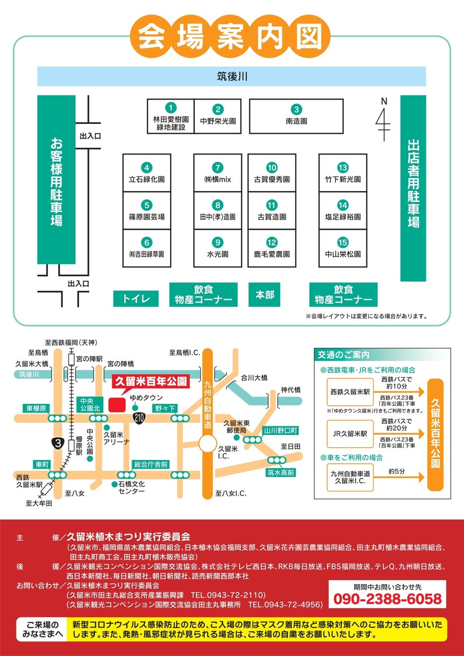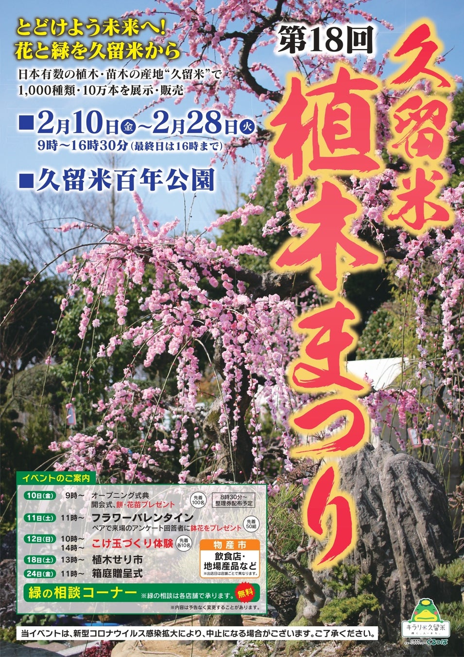 田主丸町は日本有数の植木・苗木の生産地です。その魅力を広くPRし、市の緑化産業の振興につなげることを目的としています。会場では100種10万本の植木・苗木を展示即売し、恒例の植木せり市やこけ玉づくり体験など植木や苗木の魅力を存分に楽しんでいただけるイベントもあります。