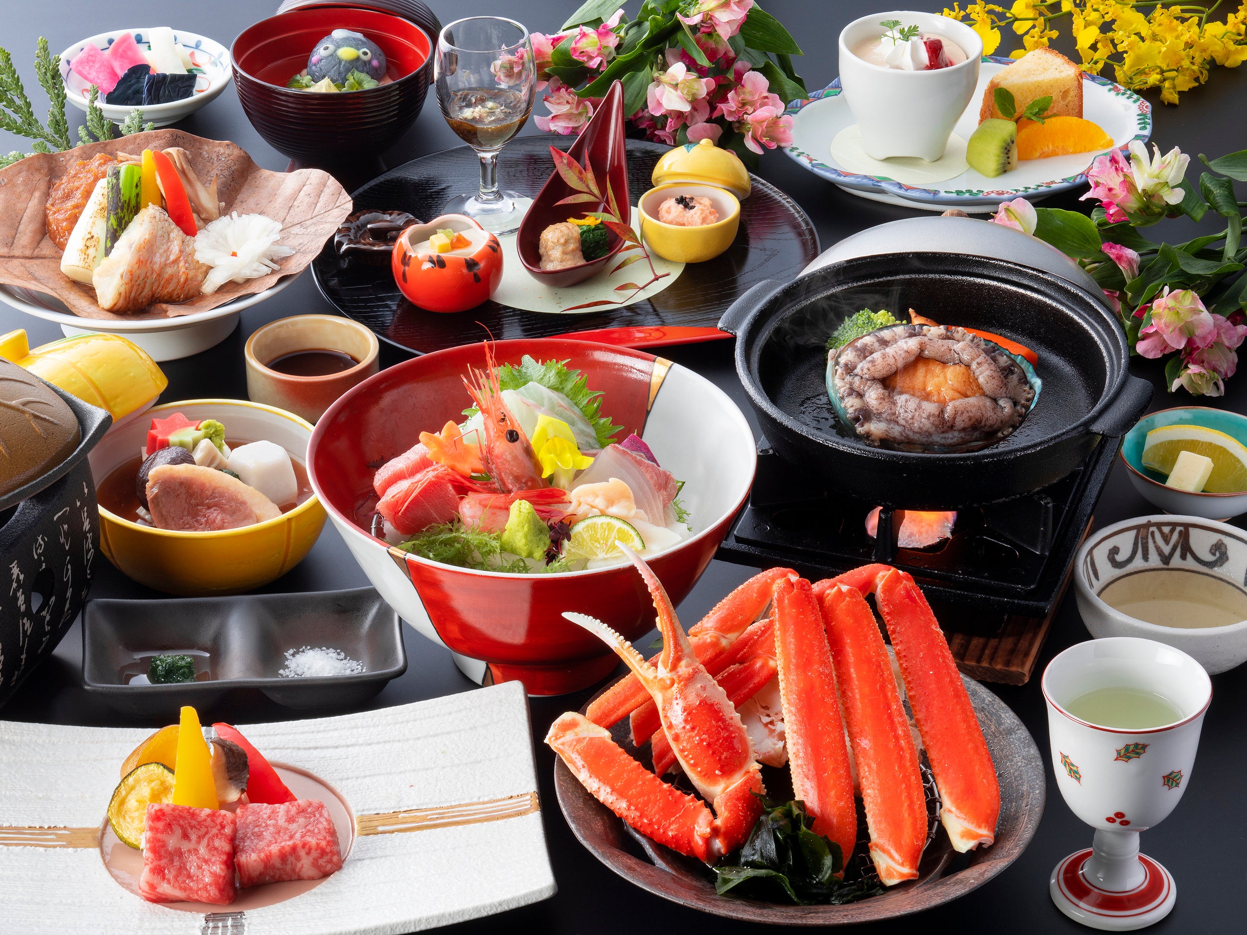 日本海と霊峰白山に抱かれた加賀平野は、四季折々の豊かな恵みをもたらす食材の宝庫です。技を極めた百万石の食文化が加賀料理のルーツとなりました。おもてなしの心が息づく加賀の地で生まれたゆのくに天祥の創作会席料理を、ぜひお楽しみください。