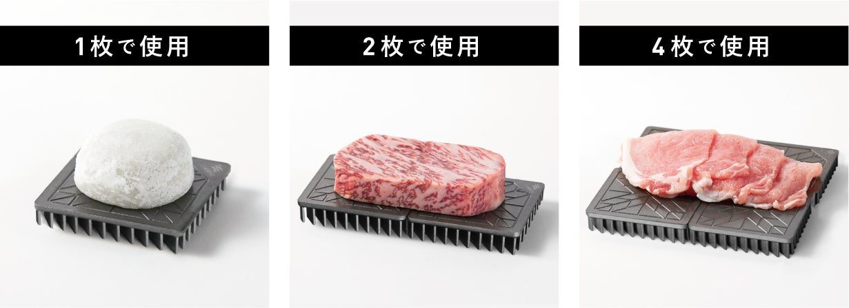 解凍プレートは食材の下に敷いて使用することが一般的ですが、上下で挟むようにご使用頂くことで、食材の中心部と外側が均一に解凍することができ、内外の解凍速度の違いによる解凍ムラを抑えることが可能です。また、食材を挟んだ状態で冷凍庫へ一緒に入れて頂ければ、冷凍速度も1.5倍程度アップします。
