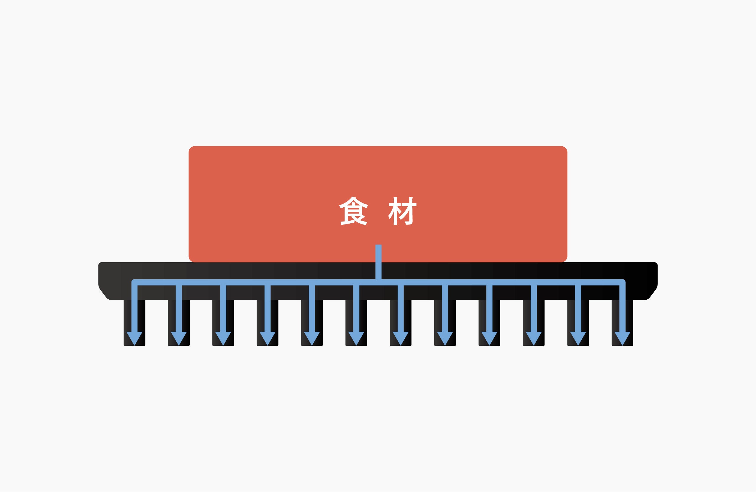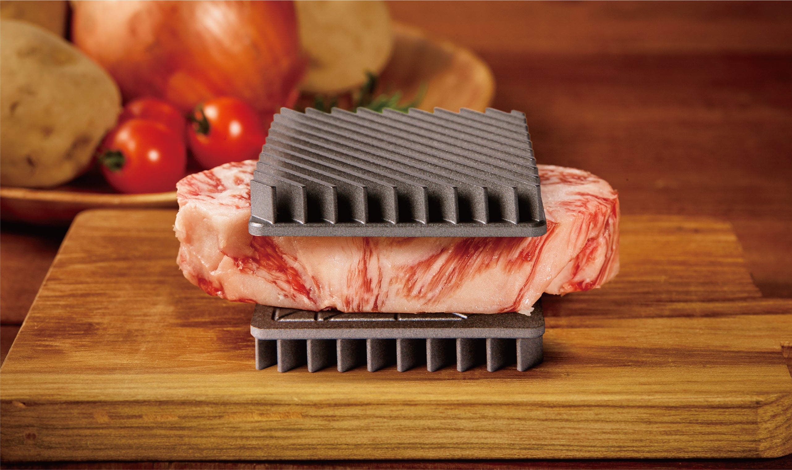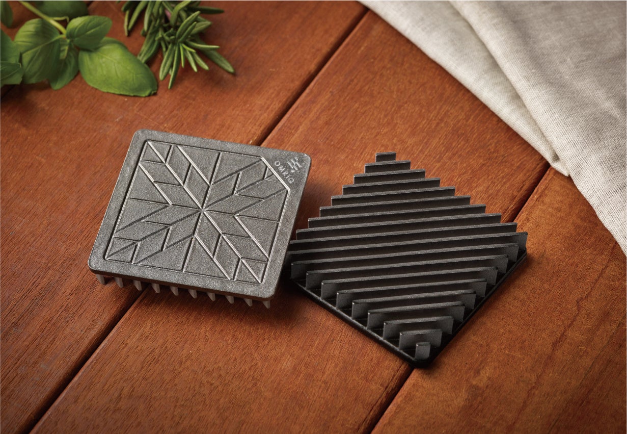 まな板サイズが一般的な解凍プレート。OMRIQ PLATEはコンパクトサイズながら、放熱効率を上げる為にフィン(羽)を設ける事で表面積を3倍に増やし、アルミの持つ熱伝導性を最大限に活かしました。解凍速度を速める事で、解凍時に食材から出るドリップ量を抑え、美味しく解凍することが可能です
