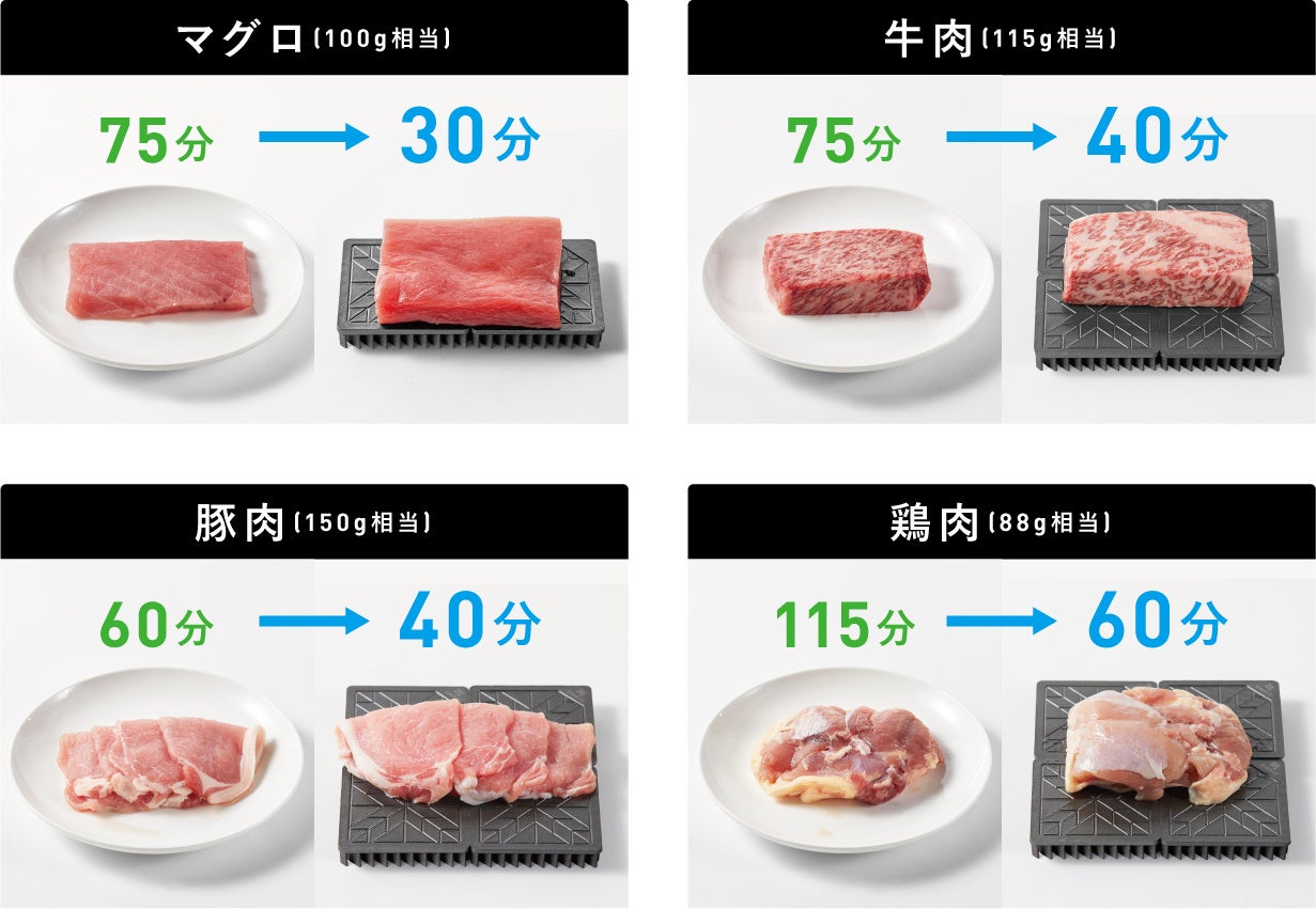『室内温度22度、常温=5度と設定』の条件下で解凍テストを行った結果は右の写真の通りです。食材に拠って解凍時間に差はありますが、1.5倍~2.5倍程度解凍時間を短縮可能。食材を挟んで解凍して頂ければ、200gの牛肉の場合、2.5倍程度解凍が速くなります。