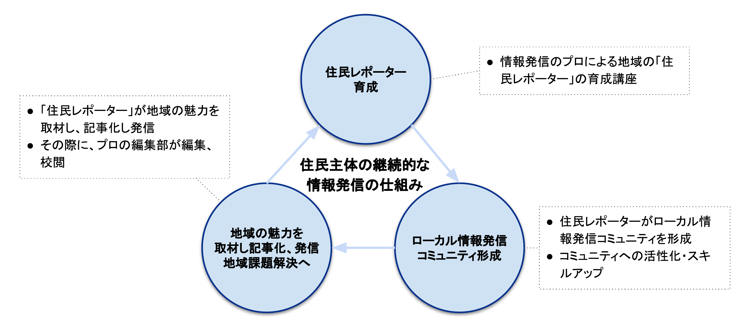 新聞社が力を失っていく中、発信されないが故に無いことになってしまう「情報砂漠」を防ぐには、地元住民自身が、地域の魅力を発掘・発信する仕組みの構築が不可欠だと考え、住民自らで地域の魅力を発掘・発信し、さらに継続的な情報発信し続ける仕組み「ロカ・ソリューション」のサービス提供に至りました。