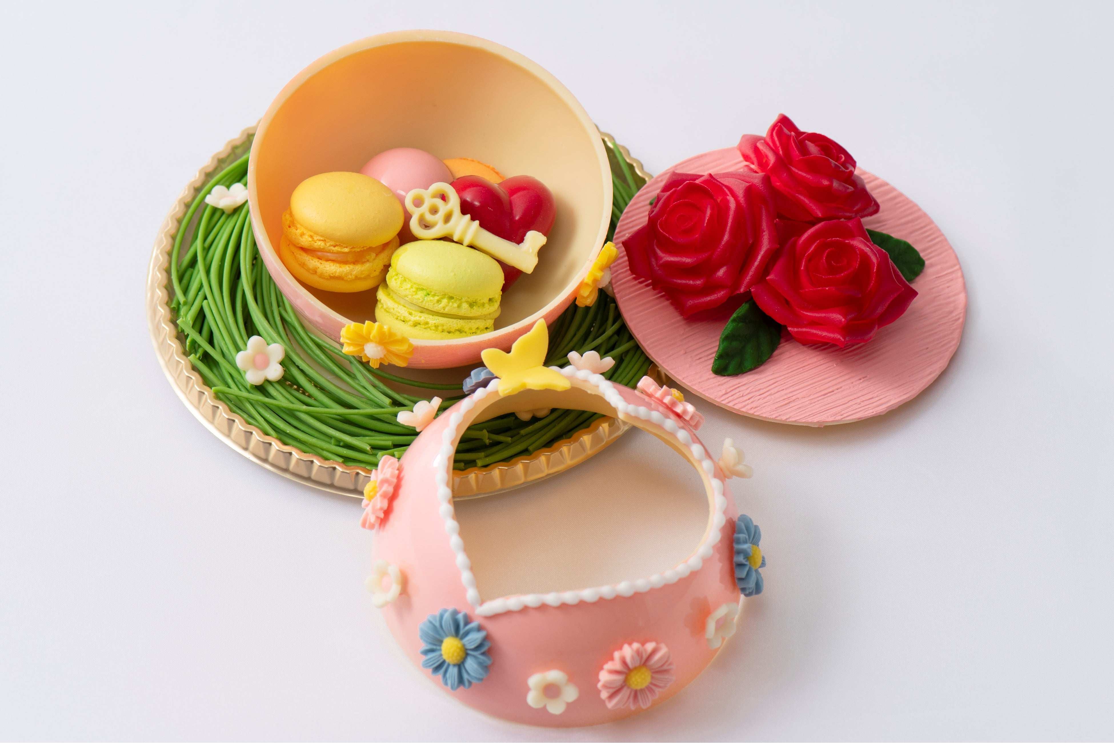 「愛情」の花言葉をもつ深紅のバラがブーケのようにあしらわれており、普段はなかなか伝えられない相手への気持ちを密やかに告げるスイーツです。中には可愛らしいマカロンやボンボンショコラと、心の扉を開く鍵をモチーフにしたチョコレートが入っています。受け取った方が思わず笑顔になるようなキュートで情熱的なギフトです。
