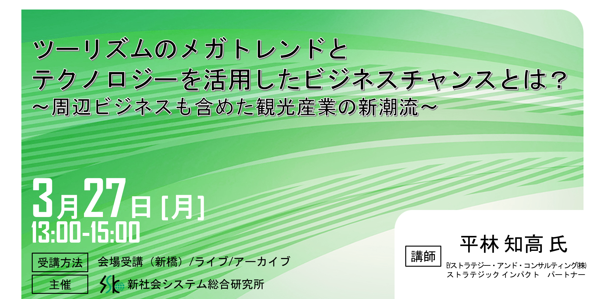 本セミナーでは、コロナ禍のツーリズムの状況を振り返るとともに、パンデミックにより変化した人々の価値観の変化に着目し、今後のツーリズムのメガトレンドをお示しするとともに、テクノロジーを活用したツーリズムにおけるビジネスチャンスについてお話しします。