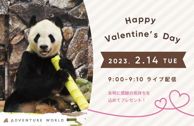 アドベンチャーワールド(和歌⼭県⽩浜町)では、2023年2月14日(火)のバレンタインデーに、16頭の父親であり、いつもたくさんのスマイルを創造しているジャイアントパンダ「永明(えいめい)」へ、日頃の感謝を込めてスタッフよりプレゼントを贈ります。今年は大好物の食材を飾り付けたバレンタインスペシャルプレートと竹文字の「ありがとう」をプレゼント。イベントの様子は、公式YouTube・Instagramにてライブ配信いたします。