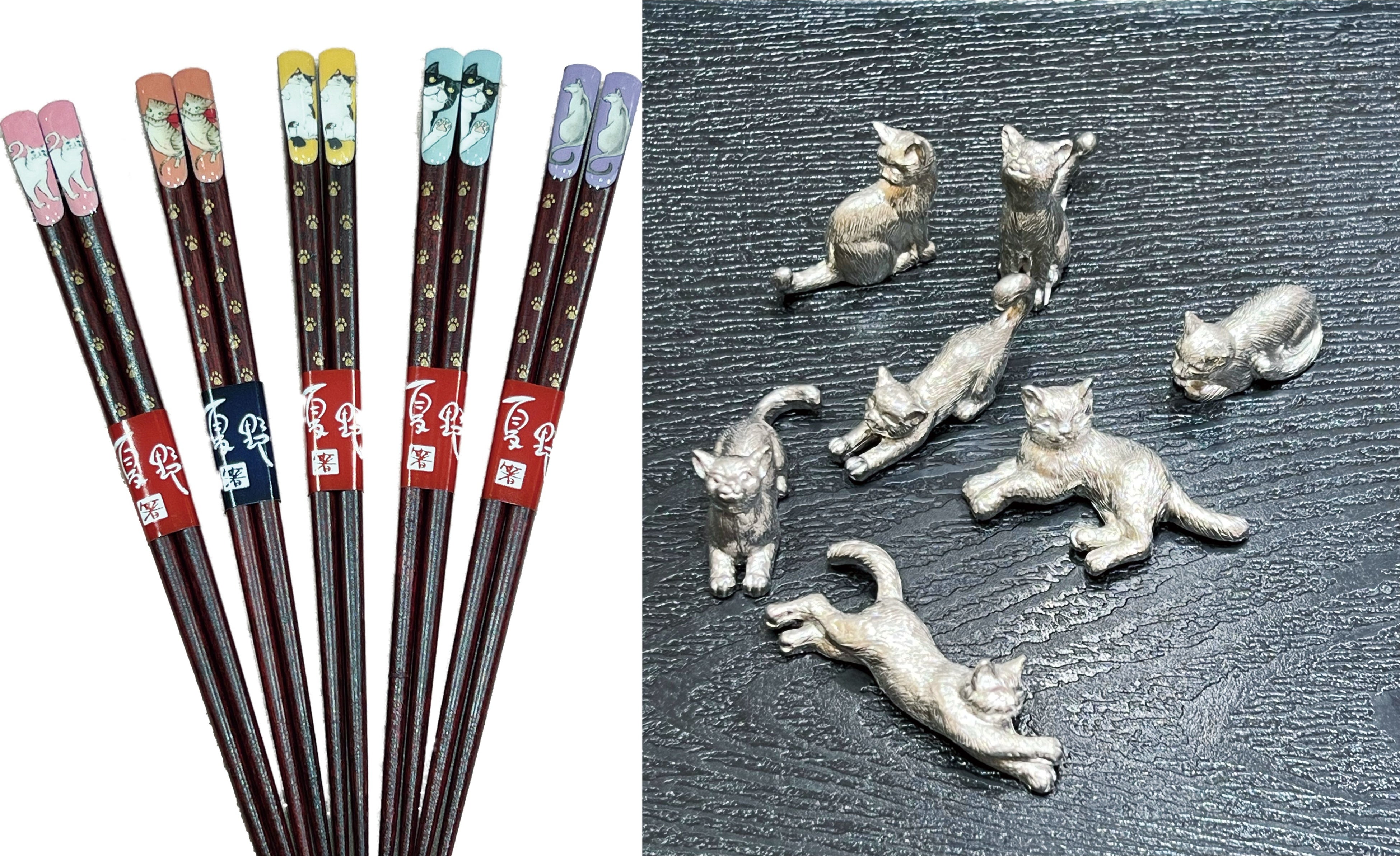 (左)オリジナル天削ねこ箸 各¥1,320 (右)錫で出来た猫の箸置き 各¥1,650