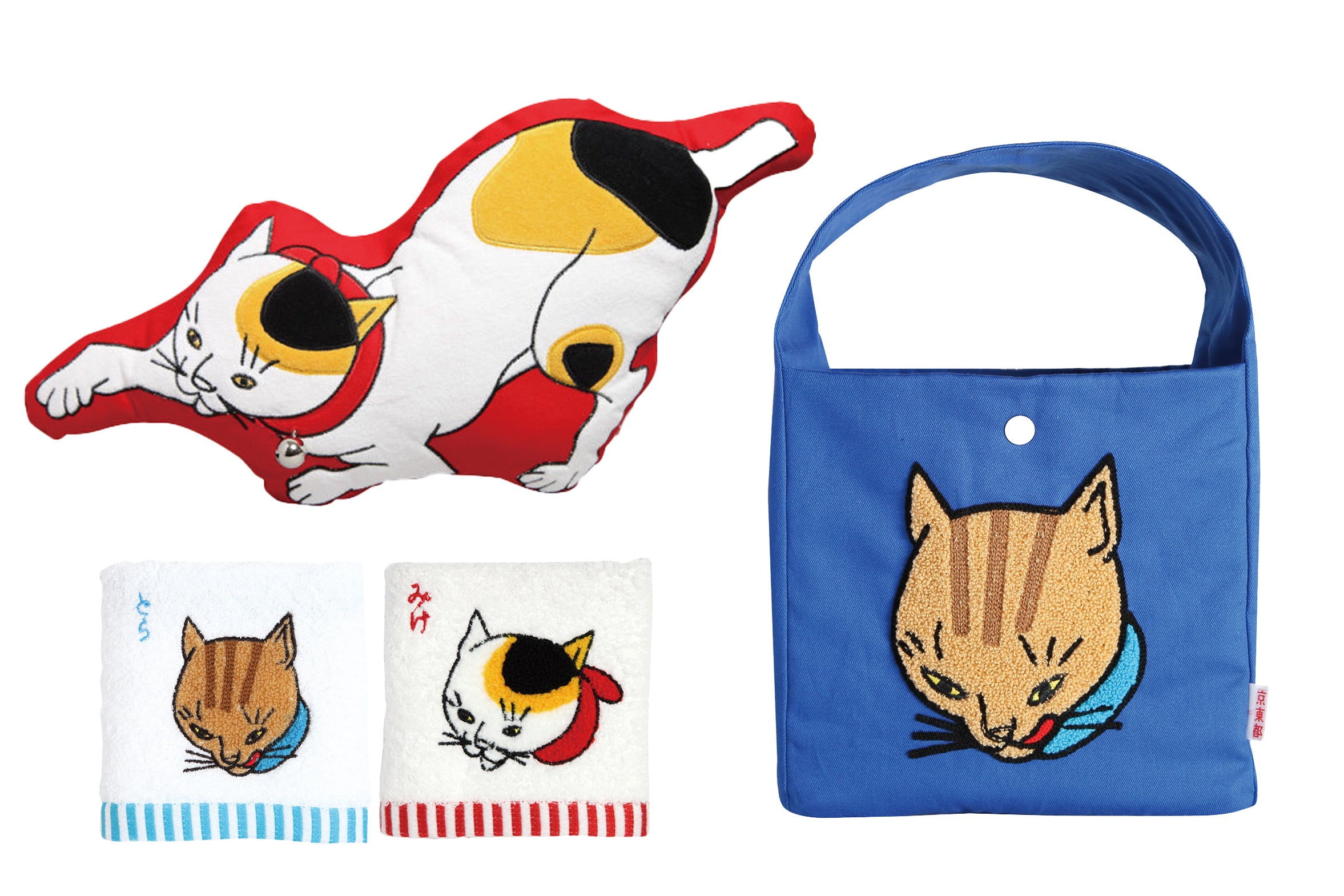 (左上から時計回り)ぬいぐるみ みけ ¥6,050 猫ミニバッグ とら ¥6,380 ハンドタオル とら/みけ 各¥1,430