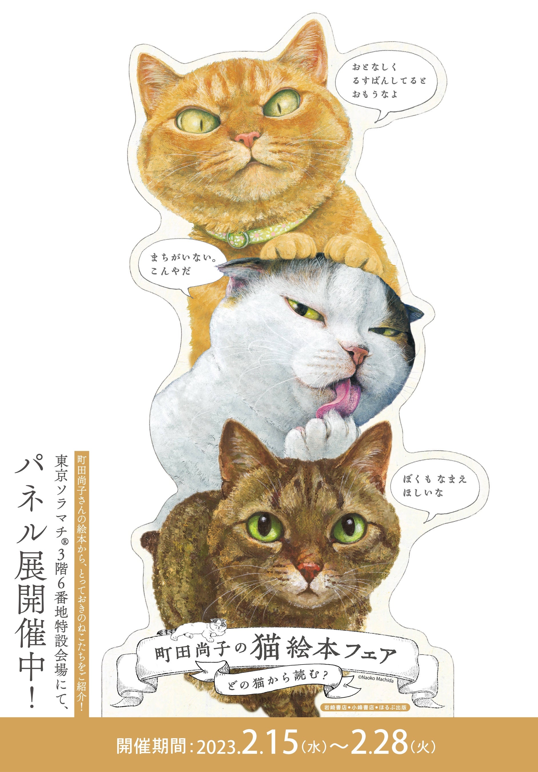 人気絵本作家町田尚子氏が描いた猫の絵本の原画(複製)パネルを展示。絵本の中に登場するとっておきのねこたちを紹介します。