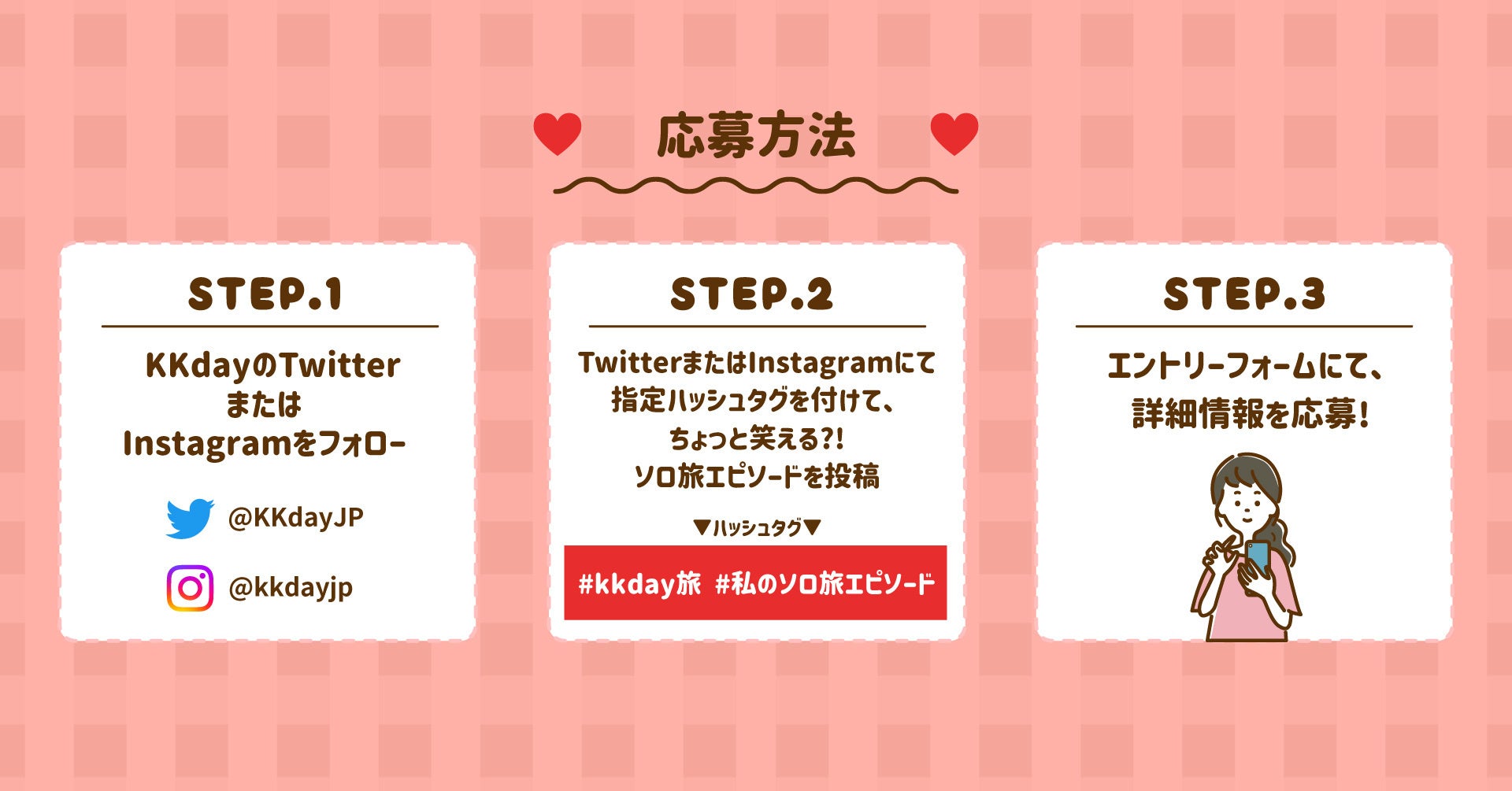 KKdayでは、SNS(TwitterもしくはInstagram)にて、ソロ旅(=1人旅)エピソードを投稿して応募する形式で、以下のプレゼントキャンペーンを実施します。