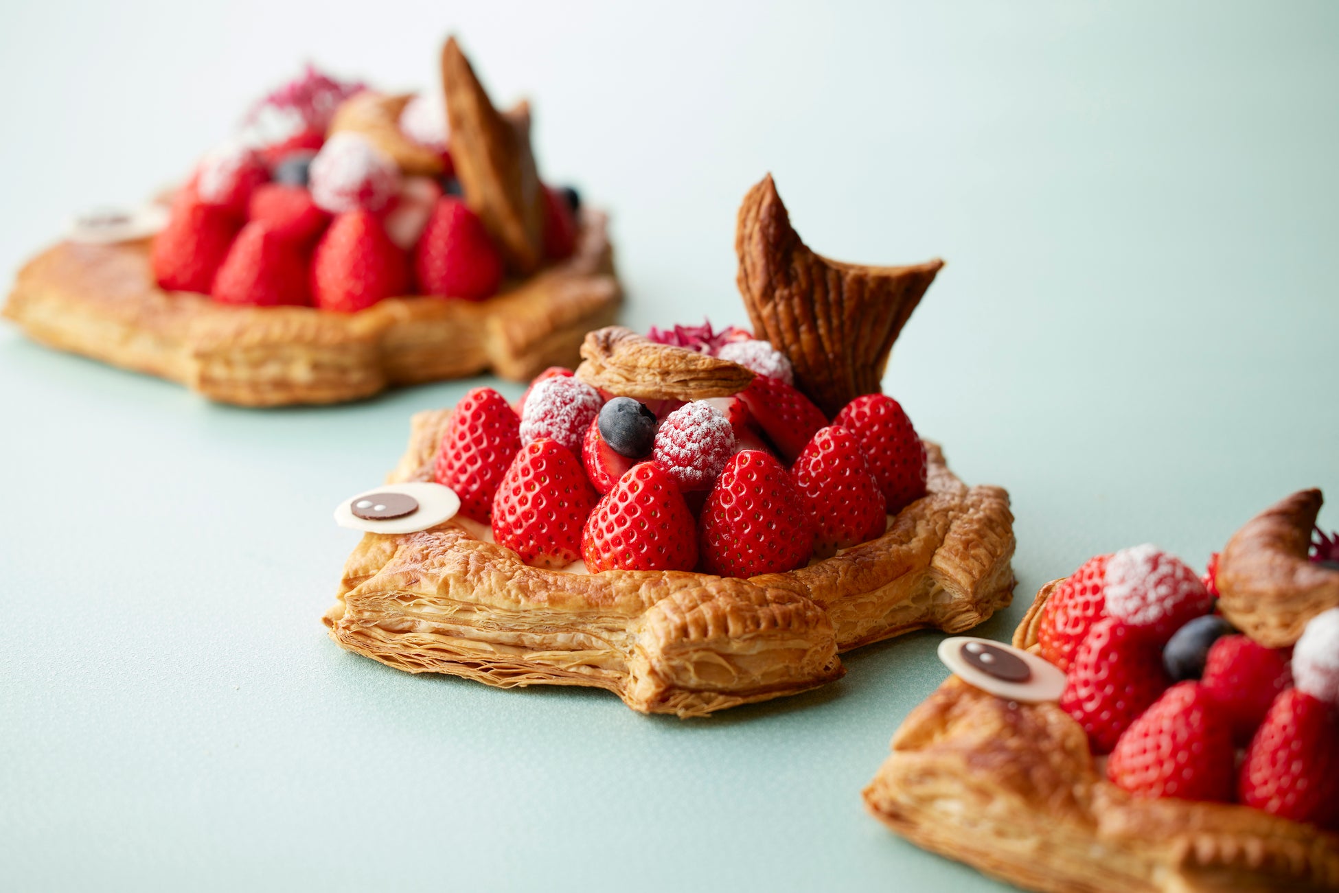 グランドニッコー東京 台場においても毎年ご好評をいただいており、本年は、バターの風味豊かなサクサクのパイ生地に、フレッシュないちご、ブルーベリー、ラズベリーの3種をあふれそうなほどたっぷりと乗せました。魚のひれをイメージしたパイや、チョコレートで表現した大きな魚の瞳が可愛らしい、見た目もお楽しみいただける一品です。
