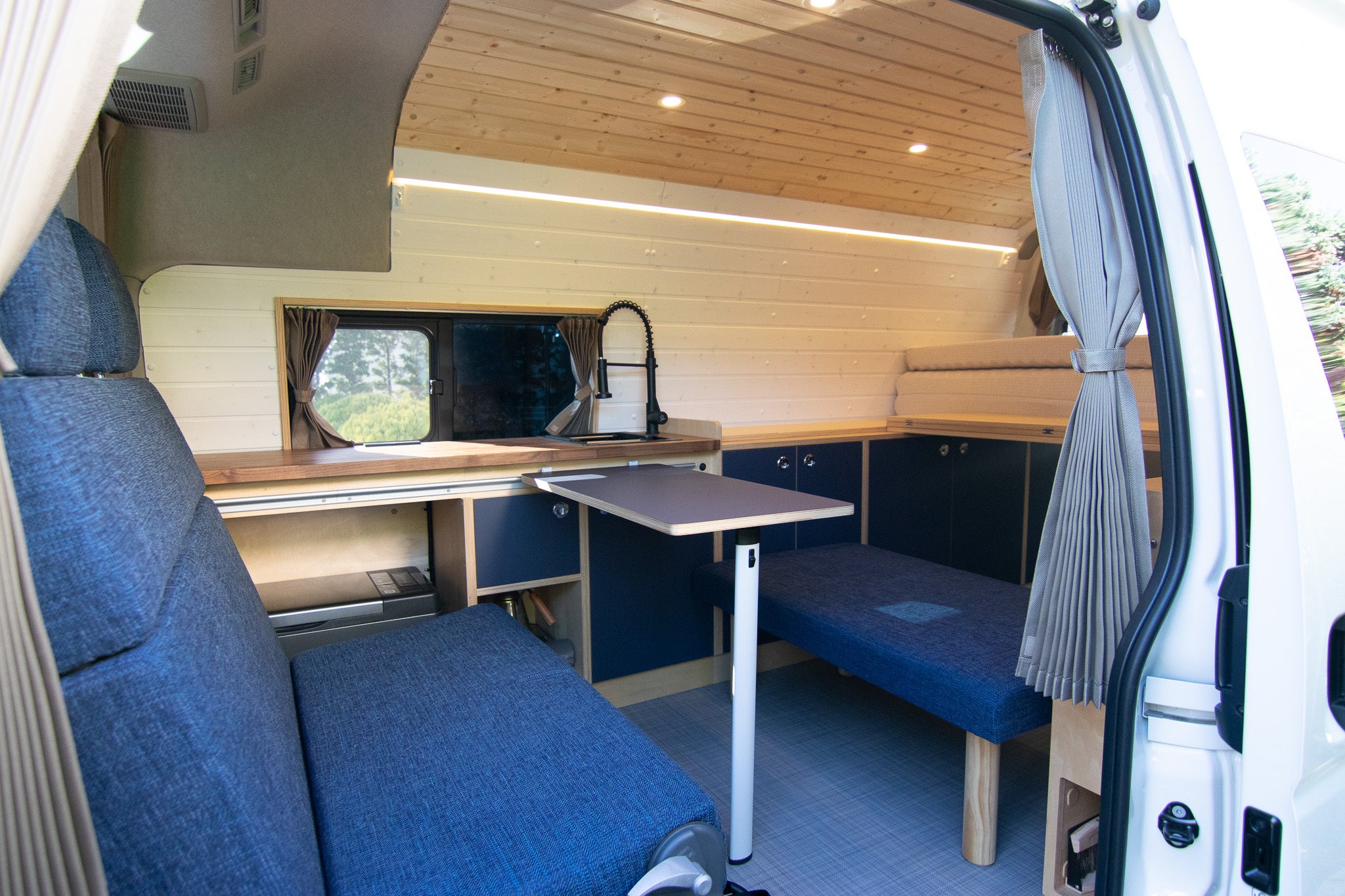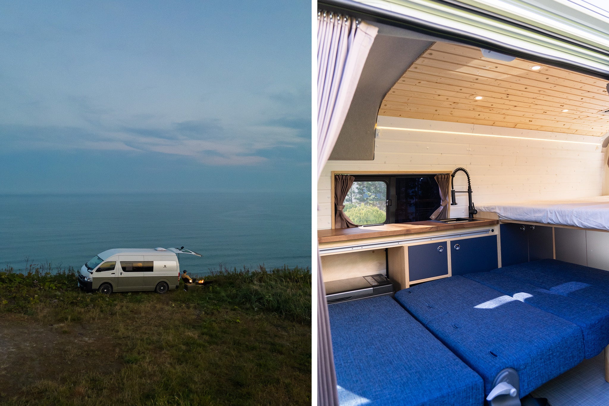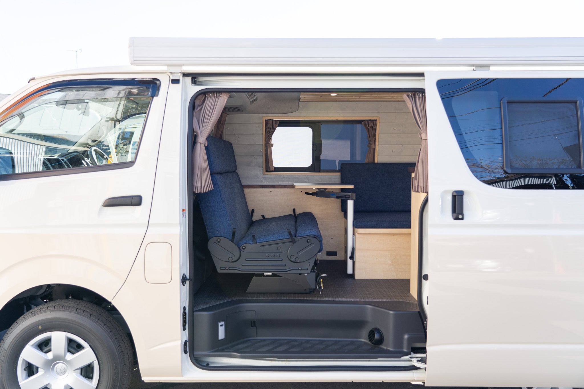トヨタ・ハイエース 標準ボディをベースに架装した、ハイエースキャンピングカー「TAMA」は普通車と同じ感覚で運転しやすく、取り回しの良いボディサイズながらも、無垢材を惜しみなく使った快適な車内空間が特徴です。