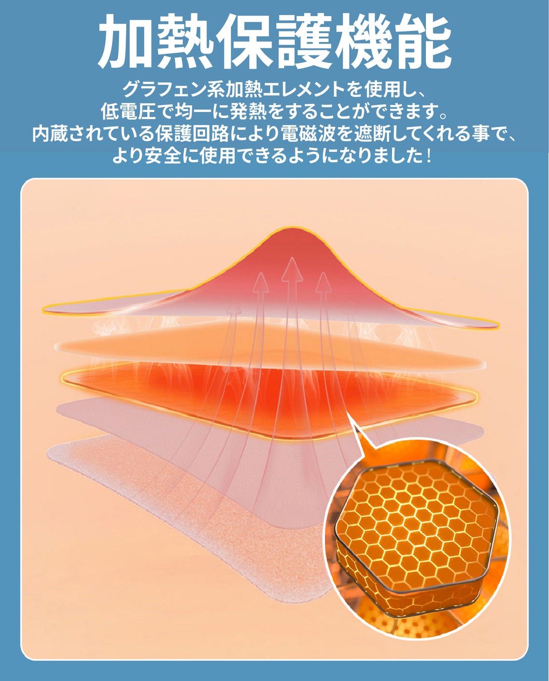 低電圧で均一に発熱をすることができるため、使用時に熱を逃がすことがなく暖かさを一定に保ってくれます。