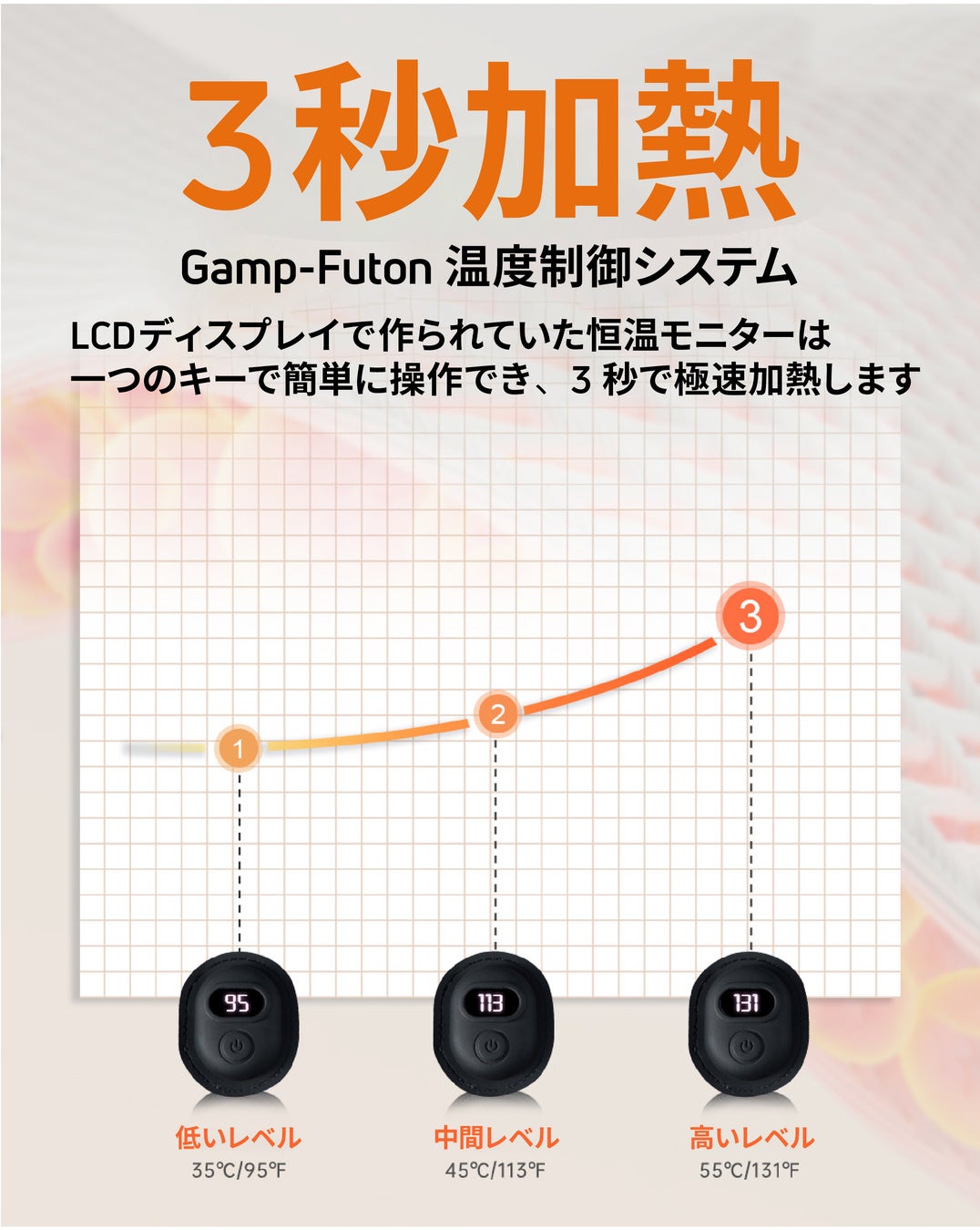 Gamp-Futonは「AI温度制御システム」を導入しており、温度は3段階で調節可能になっています。