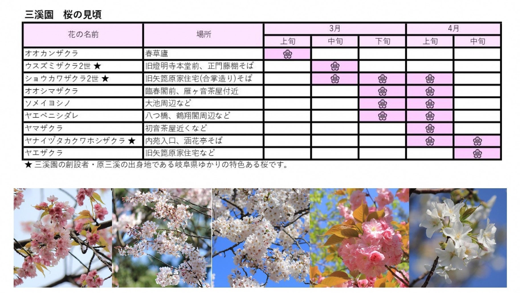 三溪園の創設者・原三溪が現在の岐阜県柳津町出身であったことから、園内には岐阜県ゆかりの桜が3種所在します。岐阜県本巣市に所在する樹齢1500年余りと言われる国の天然記念物を親木にもつ「淡墨桜2世」、岐阜県高山市にある樹齢450~500年余りと言われる古樹を親木にもつ「荘川桜2世」、岐阜県柳津町で育成されてきた花弁が星形をした「柳津高桑星桜」です。このほか園内で咲く9種類の桜は、春の訪れとともに週ごとに移り変わります。